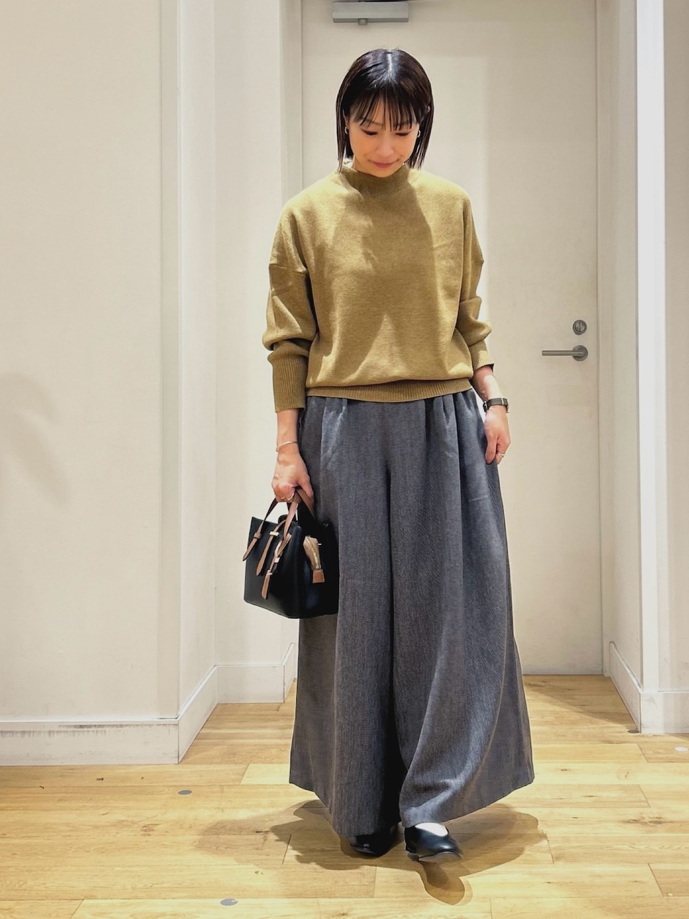 柔らかい生地を使用しているためワイドながらも野暮ったくならず、ニットやアウター合わせにもバランスよく着ていただけるアイテムです。