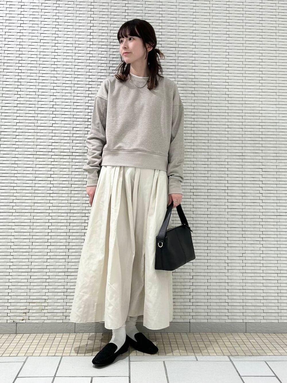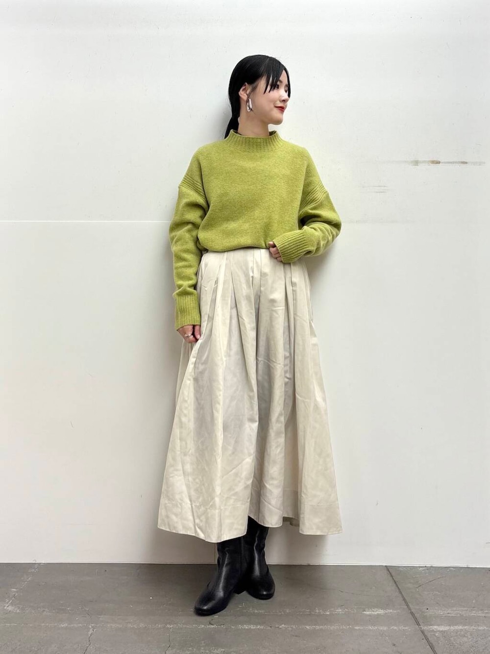 生地に程よくハリがありボリュームの出るタックデザインなので、コンパクトなトップスやシンプルなデザインと合わせて主役にしたい一着。