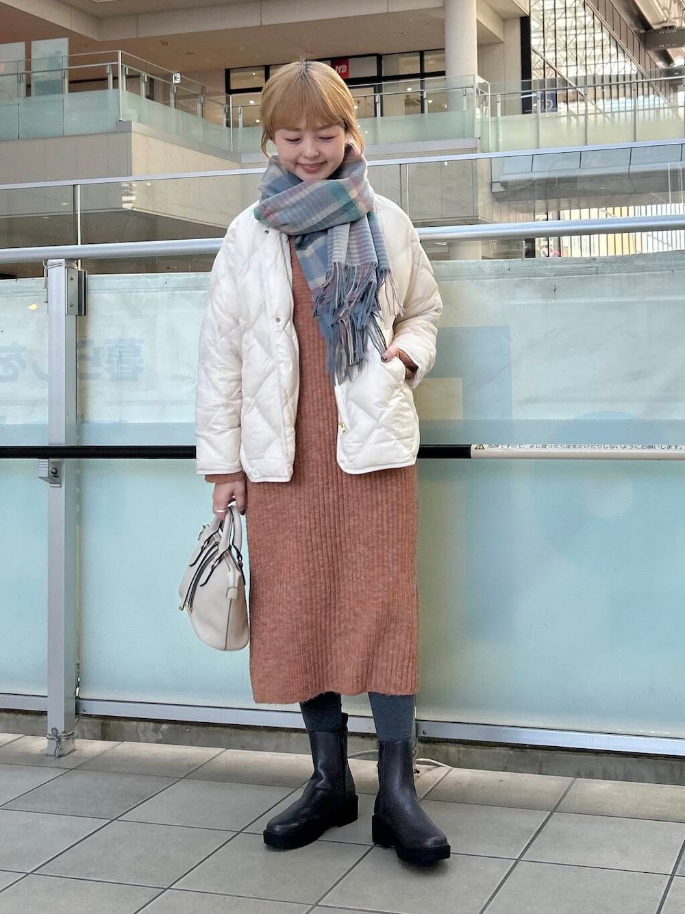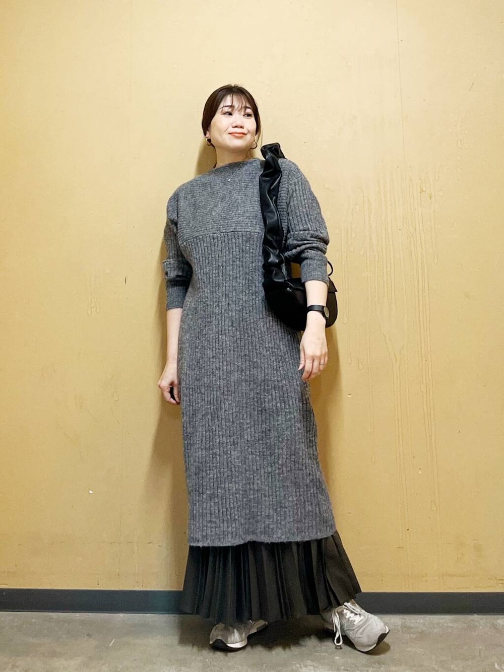 スッキリと縦のラインを演出してくれるシンプルなデザインのニットワンピース。