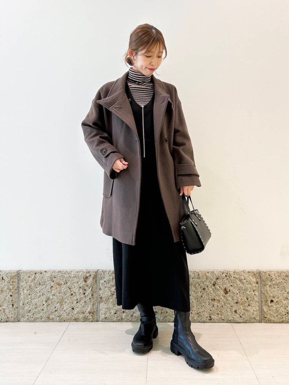 トレンド感のある高めのスタンドカラーが首元を暖かく包み込んでくれるシンプルなコート。