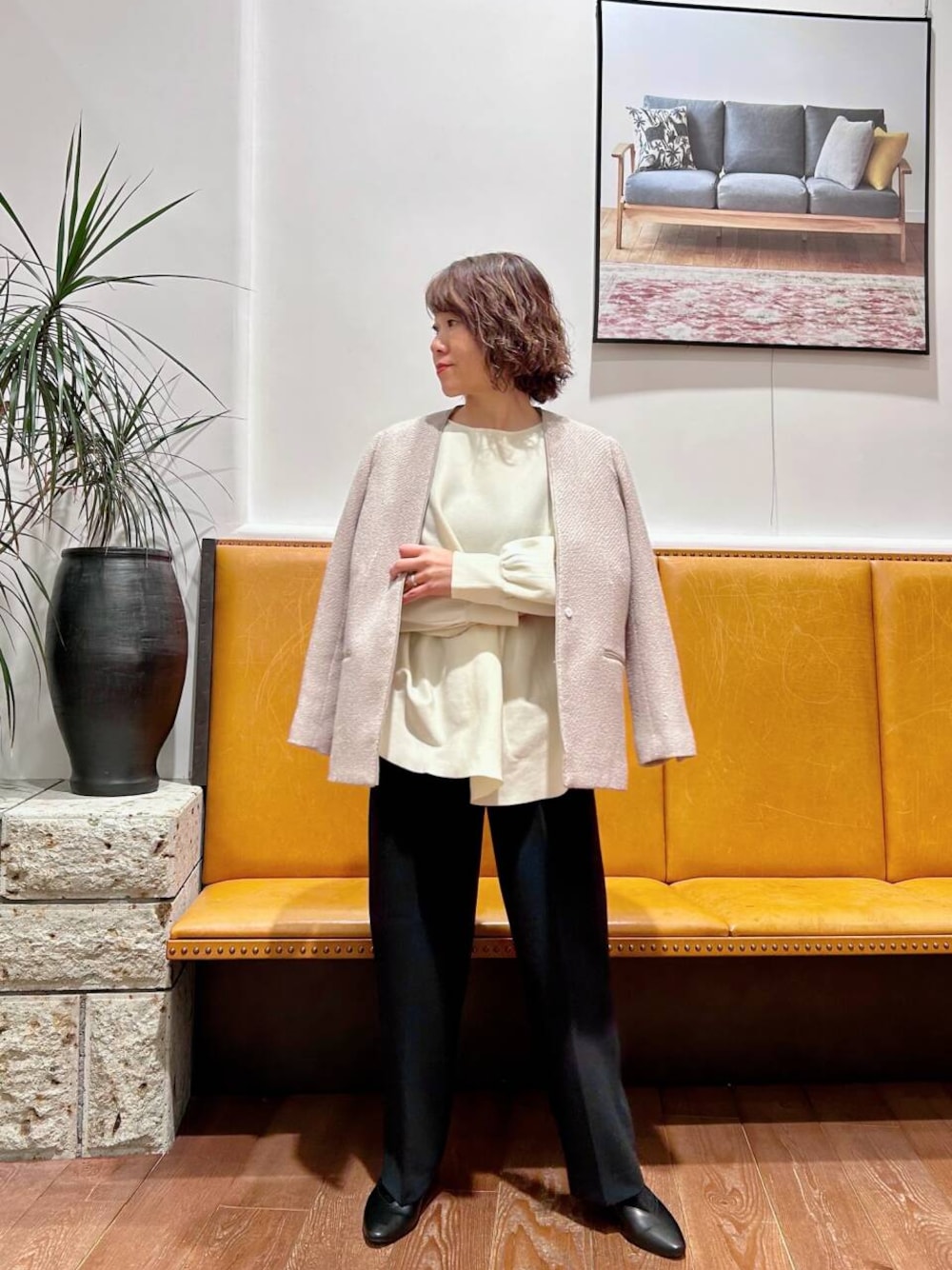 膨らみのあるツイード生地を使用したジャケットは上品でリッチなアイテム。
