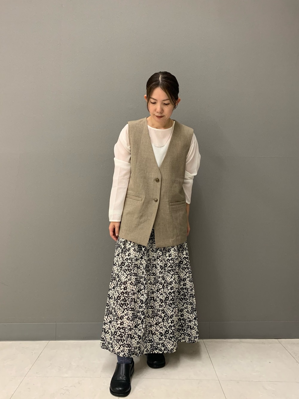 同柄のブラウスとセットアップで着用すれば、ワンピース風のスタイルも楽しめます。