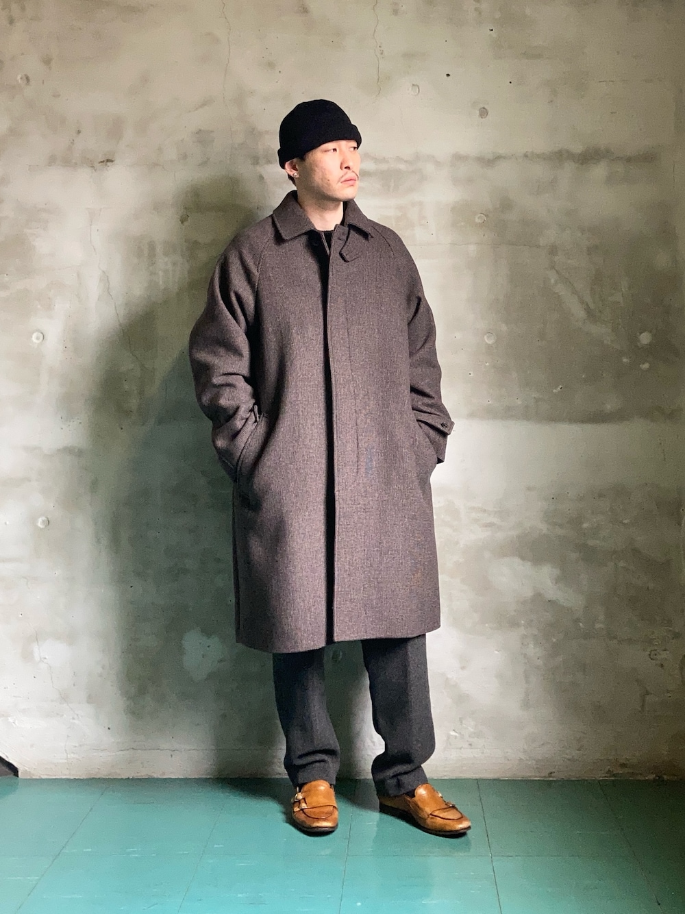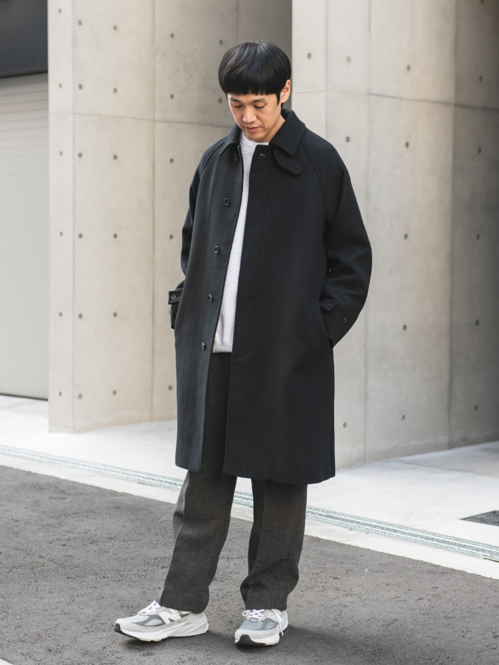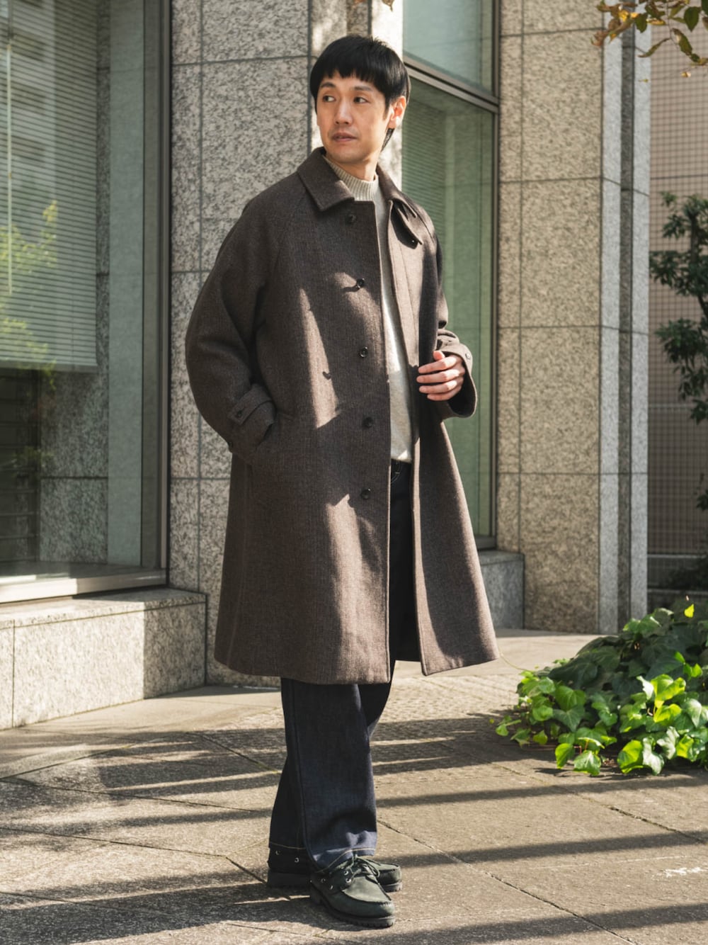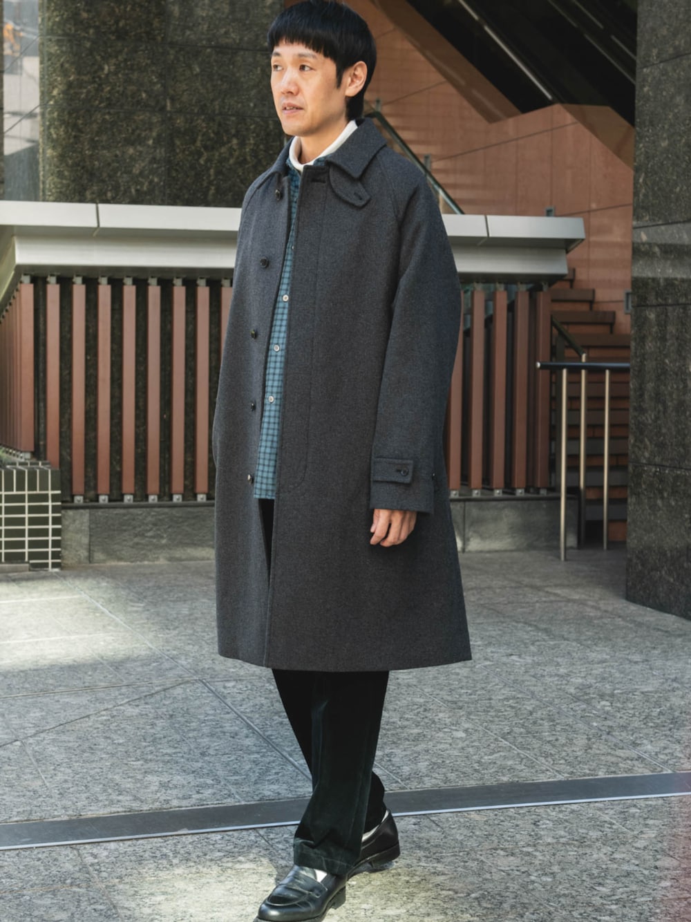 ウールのふくらみと温かみを感じるメルトン生地を使用したロングコート。