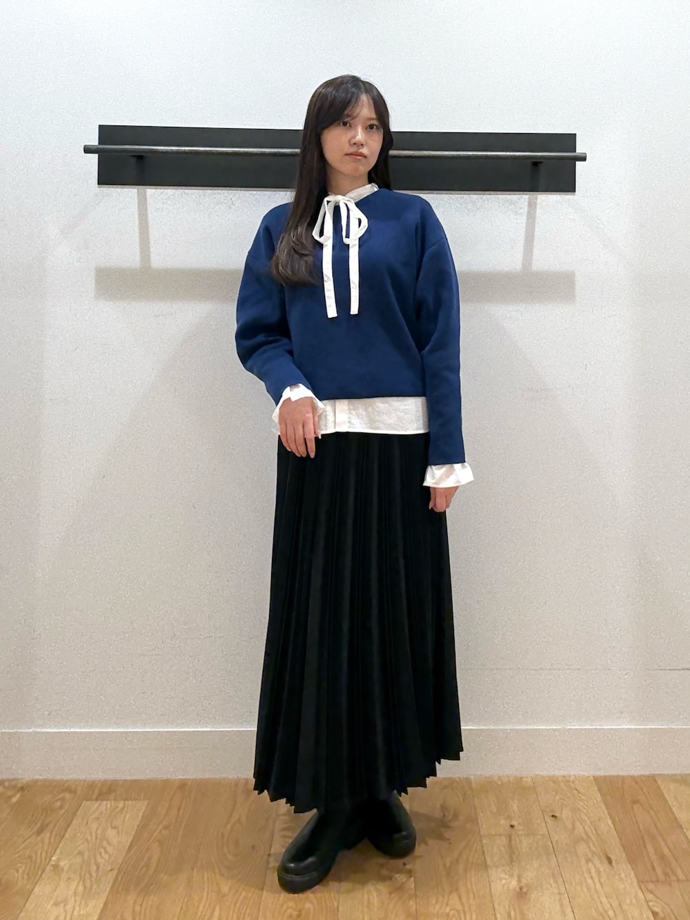 きれいなプリーツラインが美しく揺れ、ボリュームのあるニットともバランスよく合わせられるため、カジュアルからきれいめまで幅広いスタイリングに対応します。