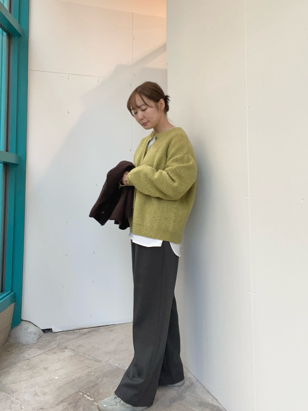首元はシンプルなクルーネックのため、タートルネックとのレイヤードやマフラーなどの小物アレンジとも好相性。