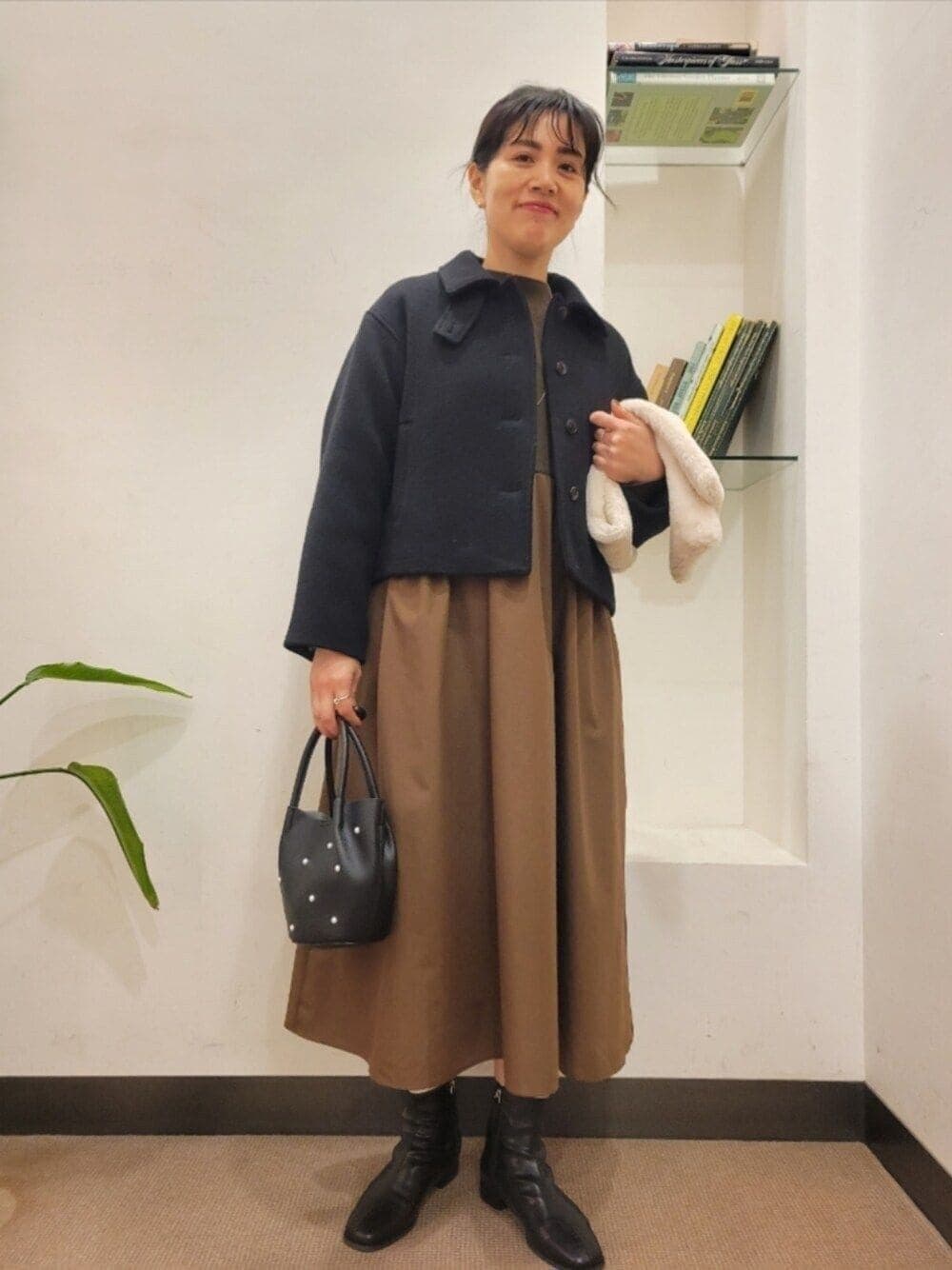 ショート丈のためロングボトムスやボリュームのあるスカートとも好相性で、重たい印象にならずスタイルアップを叶えます。