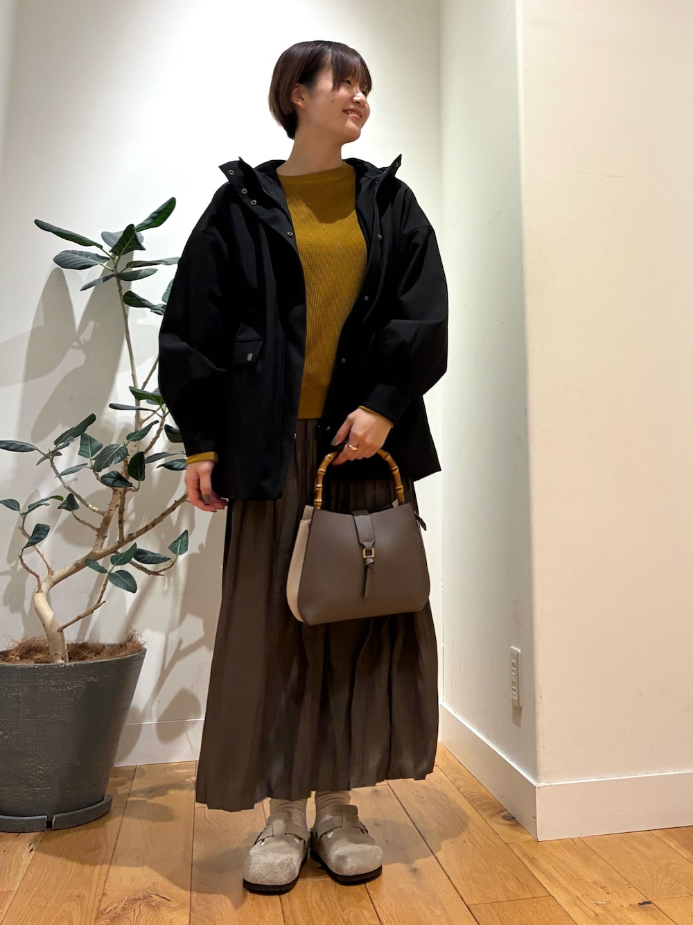少しゆとりのあるシルエットに仕上げているため、厚手のニットも安心して重ね着が可能。