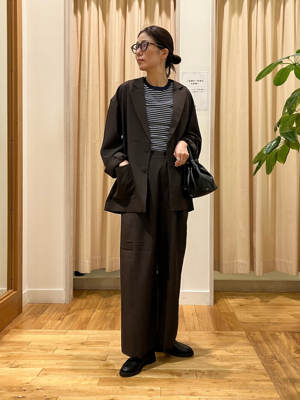 自社開発素材『UR TECH』ポリエステルの薄手ウールトロ見えの素材を使用しました。この時期には嬉しいイージーケア、UVカット、吸水速乾機能があります。シルエット感にこだわり、シングルブレストのシンプルな羽織りやすいジャケットに仕上げました。袖口と裾はルイス仕様、CB縫い代をパイピングにし、ステッチは入れずシンプルデザインになっています。インナーは、ノースリーブやTシャツなどスタイリングしやすく、冷房対策にも優秀な万能アイテム。同素材のパンツとセットアップで着用するのがおすすめです。