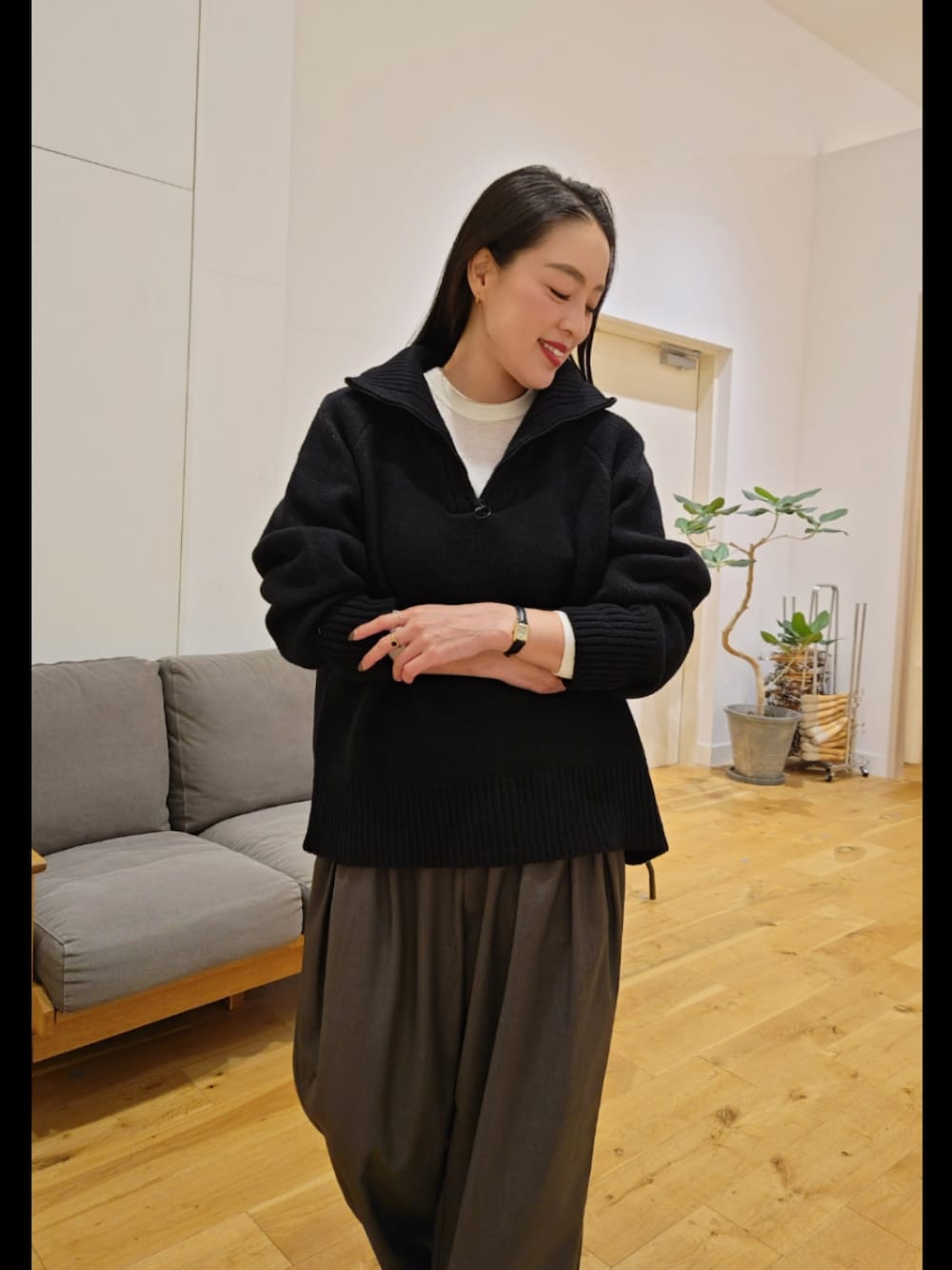 6GのWジャガード仕様で起毛感がありながらスポンディッシュなジップニット。 表裏ともポリエステル糸を使用しており、裏側はGRS認証のリサイクル糸で配色仕様にしています。 ポリエステルならではの軽い素材感と起毛感が特徴の糸でビッグシルエットながらもストレスのない着心地です。 ジップの開閉で襟元に変化をきかせた、さまざまなスタイリングが可能。 ロングコートや冬ブルゾンのインナーにもおすすめです。