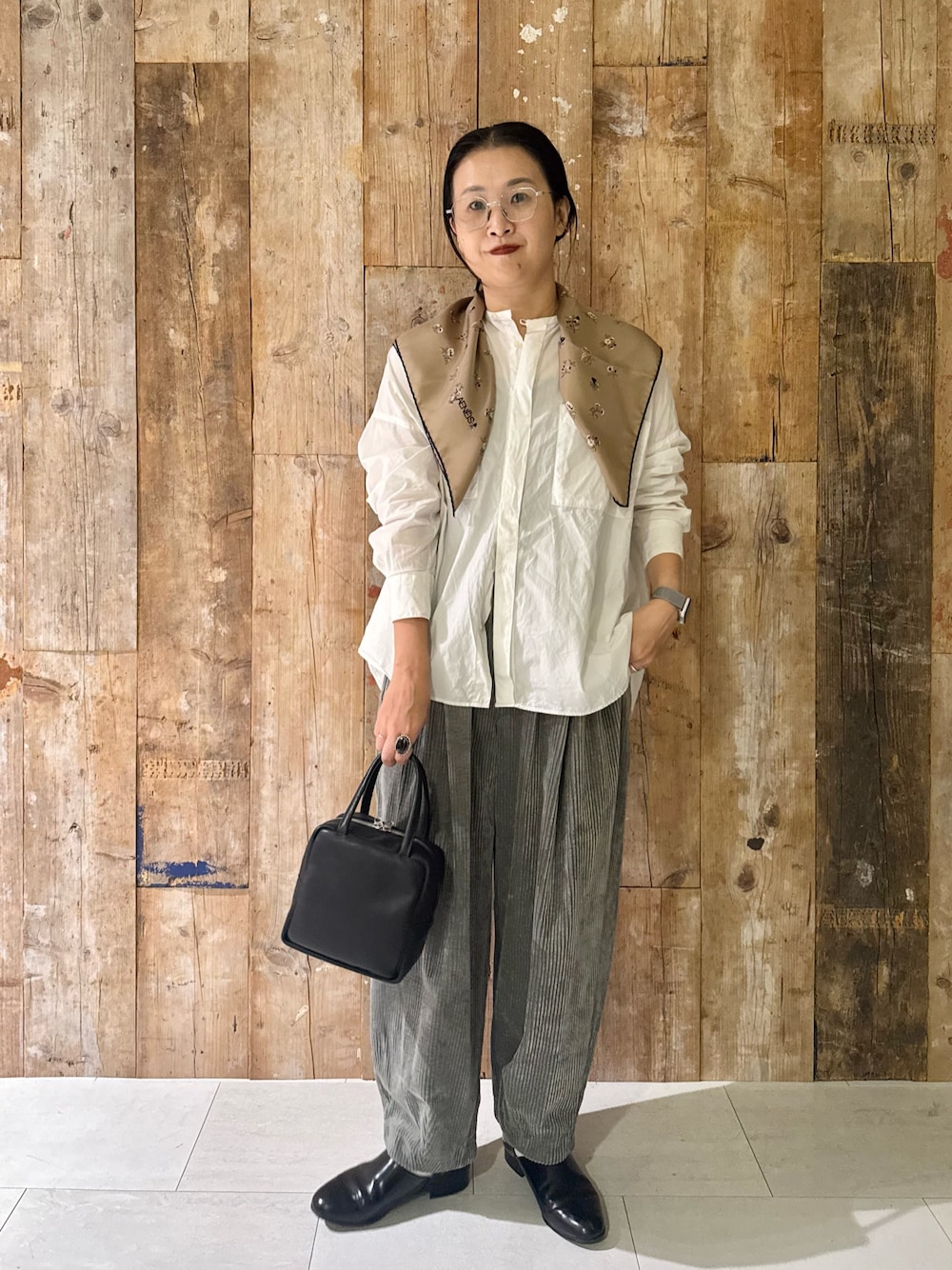 ロングシーズン着やすい綿素材で、羽織としても活躍するシャツをご用意しました。ワイドシルエットとコンパクトな首元が抜け感を演出。身幅はたっぷりとしていますが大きくは見えず、上半身のラインを拾わない絶妙なバランスに仕上げました。ボタンが見えない比翼仕様とヨークの無いすっきりとしたデザインがミニマムな雰囲気です。日常にもお仕事にもシーンを問わず着まわせるおすすめの1枚。季節が進めばベストやカーディガンを重ねたり、インナーにタートルネックを合わせるスタイリングも素敵ですよ。