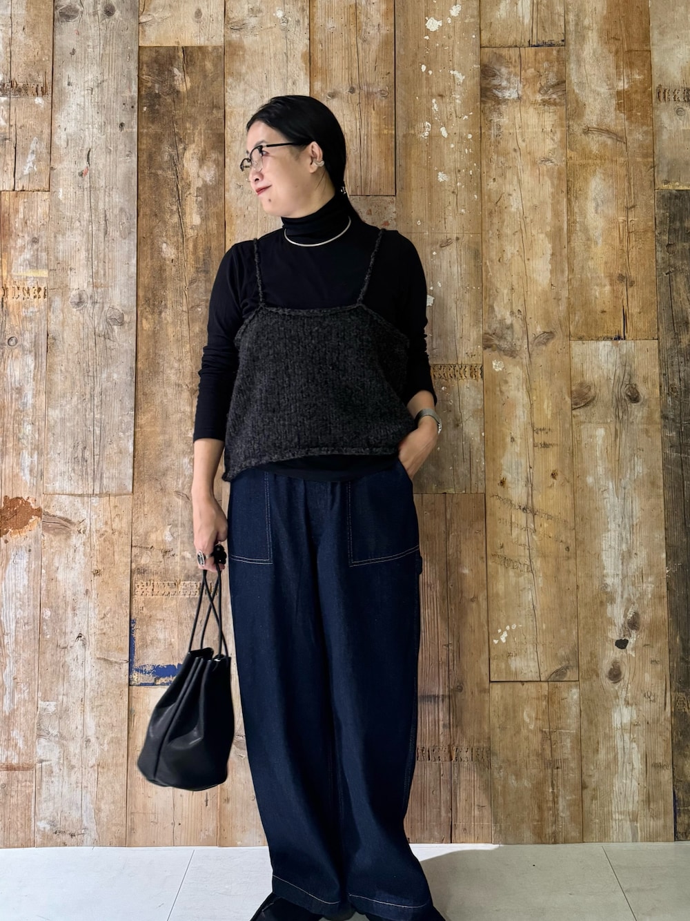 ウエストの高い位置で紐を結んでいただくか、ウエストを一折りすると短い丈感をお楽しみいただけます。