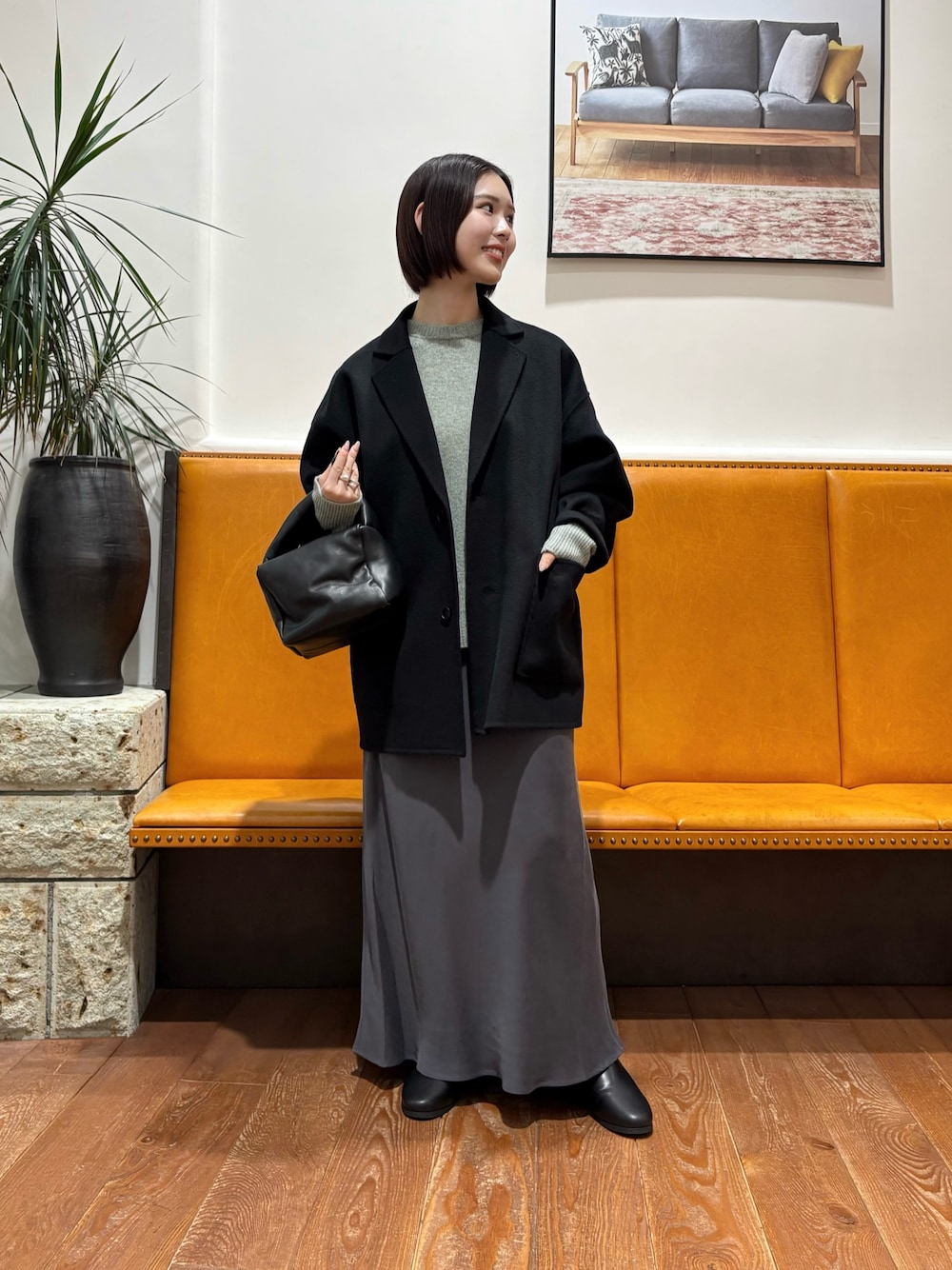 下半身を綺麗に見せてくれる優秀な一品。丈違いの2サイズご用意しました。細身に見えますが、バイヤス(生地を斜めに裁断)で仕立てているため、着用すると横方向へ伸びがあります。からだに合わせてゆとりが生まれ、体型を拾いにくいデザインです。伸縮性がありスリット無しで足さばきが良いのもポイント。大人の装いを上品に昇華します。ウエストはイージー仕様を採用。ニットやスウェットなど、少しボリュームのあるトップスと好相性です。