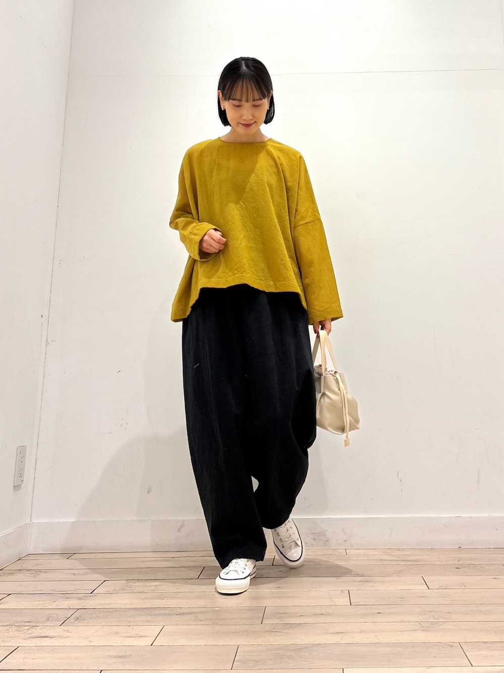涼しくなってきたら秋物としてまずおすすめしたいアイテムをご紹介します。ワイドなシルエットがポイントのプルオーバー。季節感のあるウールのガーゼ生地を使用し端境期から活躍する1枚です。身幅がたっぷりしていますが、柔らかい素材なので大きく見えずにからだの線を拾いにくいです。ノースリーブやTシャツとのレイヤードの他、冬にはタートルネックやロンTを重ねるのがおすすめ。シーズンを通して着まわしをお楽しみいただけます。