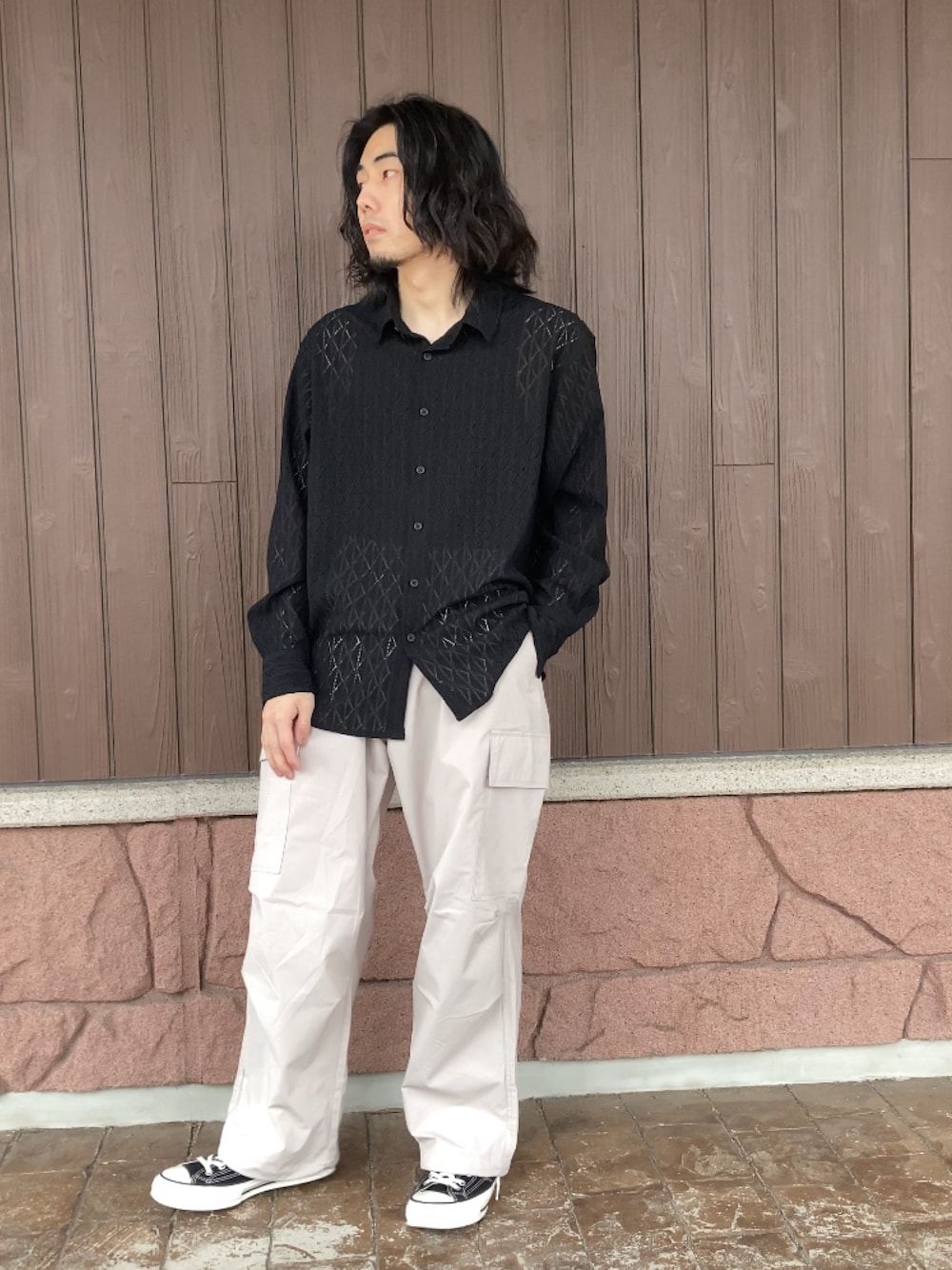 繊細なジオメトリック柄のレース素材が印象的なレギュラーカラーシャツ。ダイヤ柄の幾何学レースが生み出す立体的な表情と程よい透け感が、シンプルなコーディネートに奥行きとこなれた雰囲気をプラスします。レギュラーカラーのきちんと感に、ドロップショルダーとゆとりのあるシルエットを組み合わせることで、上品さとリラックス感をバランスよく両立。軽やかな素材で通気性も良く、春から夏にかけて快適に着用できます。一枚での着用はもちろん、インナーとのレイヤードで透け感を楽しめる、コーディネートの主役になるデザインシャツです。