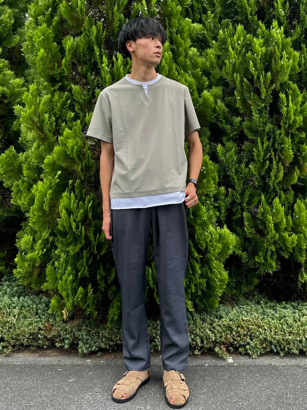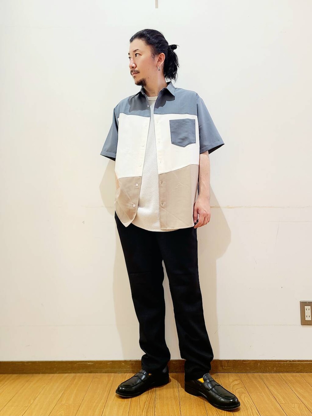 同生地を使用した高機能ツイル オープンカラー半袖シャツ(IT45-13B017)とセットアップでの着用もおすすめです。