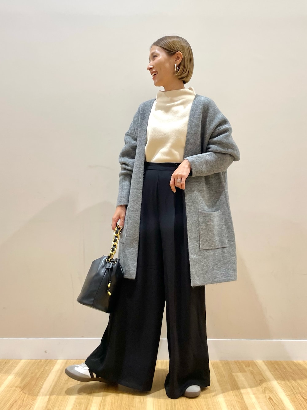 しっとりとした生地で仕立てたボトルネックニット。程よくゆるいネックデザインで、締め付け感がなくストレスフリーな着心地が魅力のひとつ。ゆとりのある着心地ながら、着ぶくれ感なく着用していただけます。
