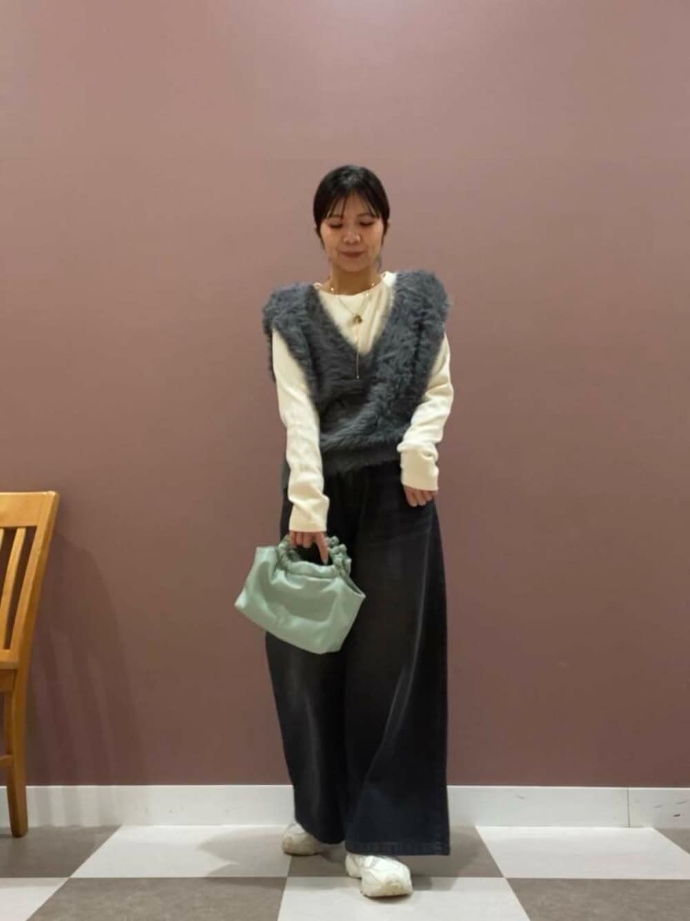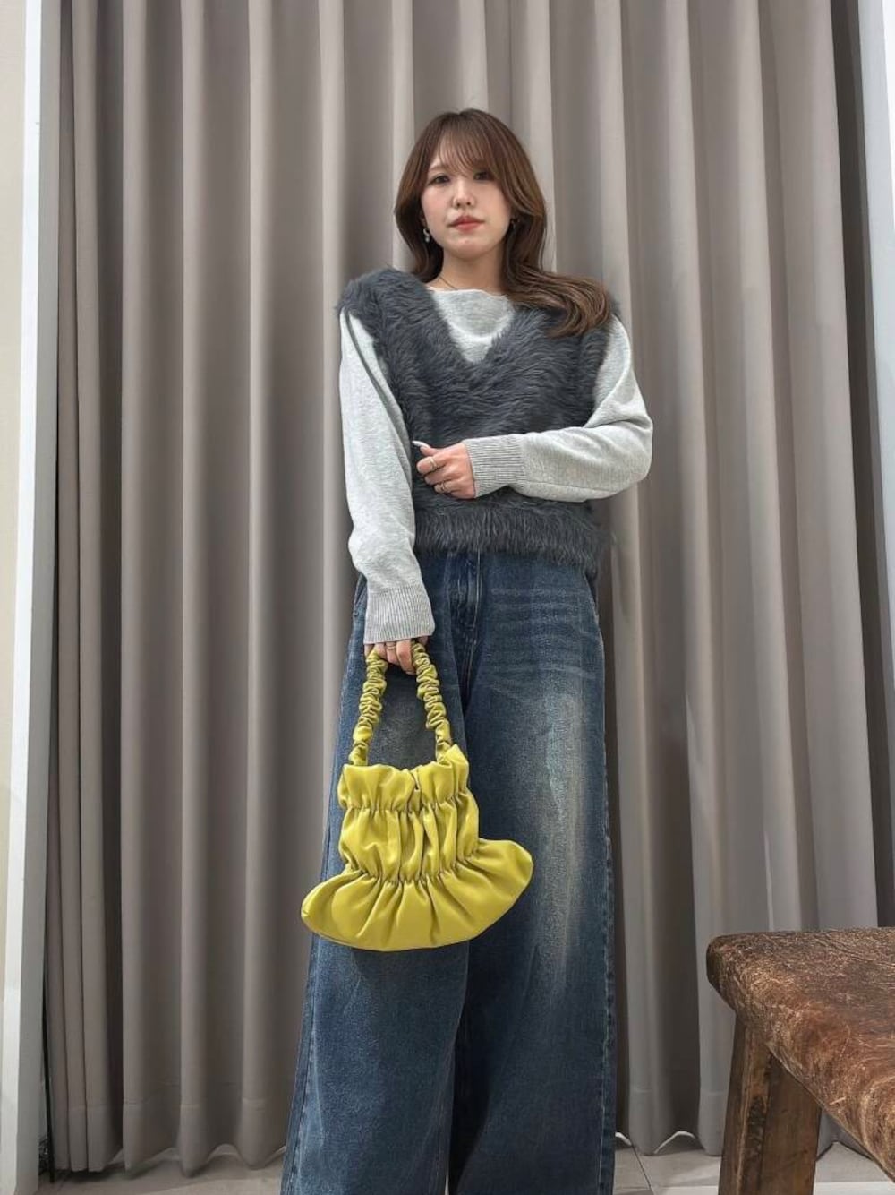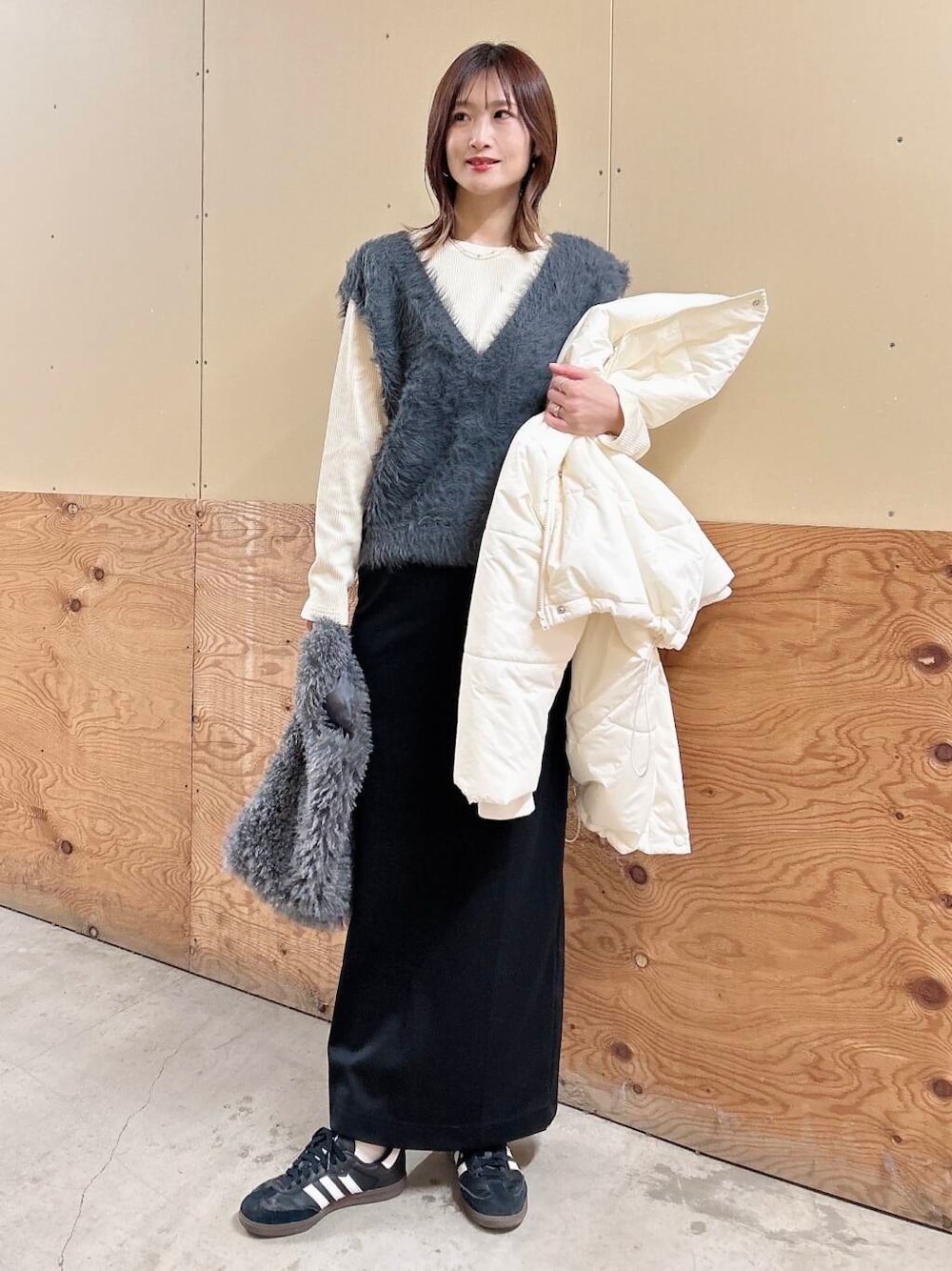 ふんわりとしたシャギー素材が印象的なニットベスト。優しい触り心地と暖かさが魅力で、シーズンレスなレイヤードスタイルにぴったりです。デザインはシンプルながらも存在感があり、インナーに柄物やカラーアイテムを合わせることで、自分らしいコーディネートを楽しめます。