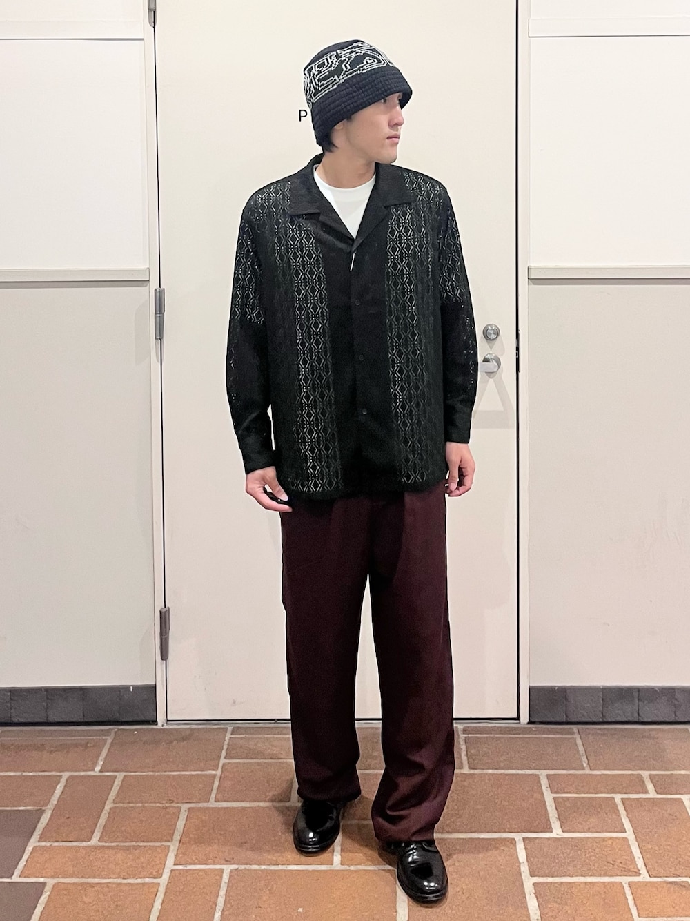 秋らしいカラーで季節感を取り入れつつ、レースの透け感で涼しく着られるジオメレースオープンカラーシャツ。