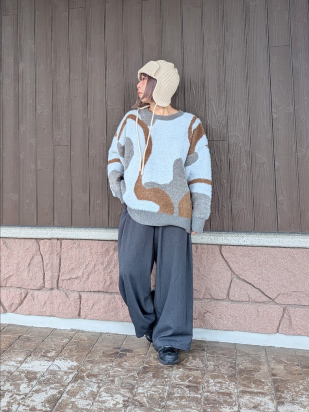 オーバーサイズシルエットで体型を自然にカバーしつつ、フェザージャガードの大胆な柄が目を引く一枚。ゆったりとした着心地でリラックス感がありながらも、デザイン性の高さでコーディネートの主役にぴったりです。 シンプルなボトムと合わせるだけで、大人カジュアルのこなれた印象を簡単に作り出せます。着るだけでおしゃれな存在感を放つニットです。