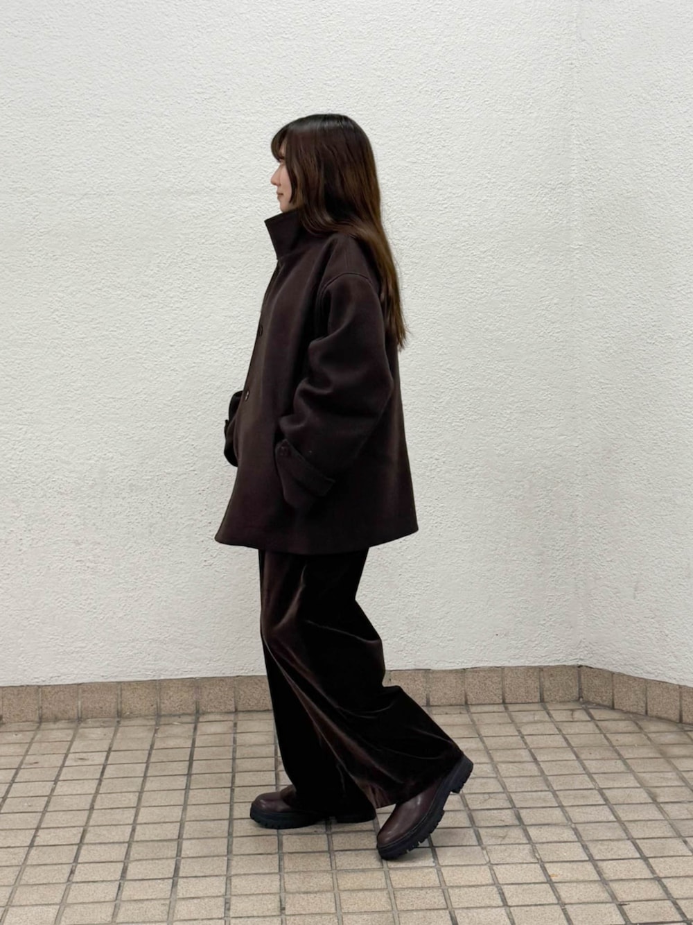 ゆったりとしたオーバーサイズシルエットとドロップショルダーで、厚手のトップスの上からもすっきり羽織れるジャケットです。首元はスタンドカラーで寒さを防ぎつつ、小顔効果も期待できます。ミドル丈でどんなボトムとも合わせやすく、冬のデイリーコーデに重宝する一枚です。