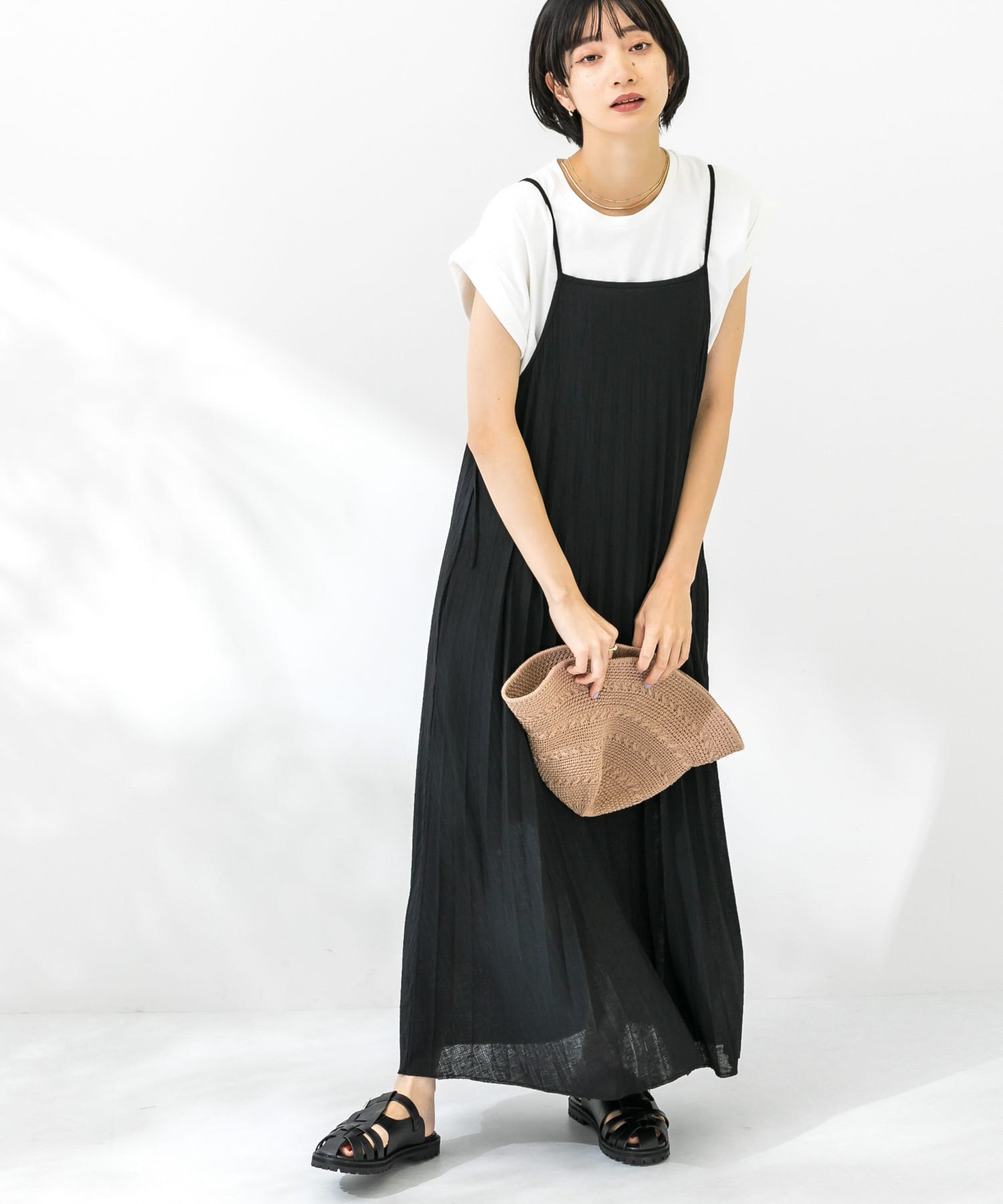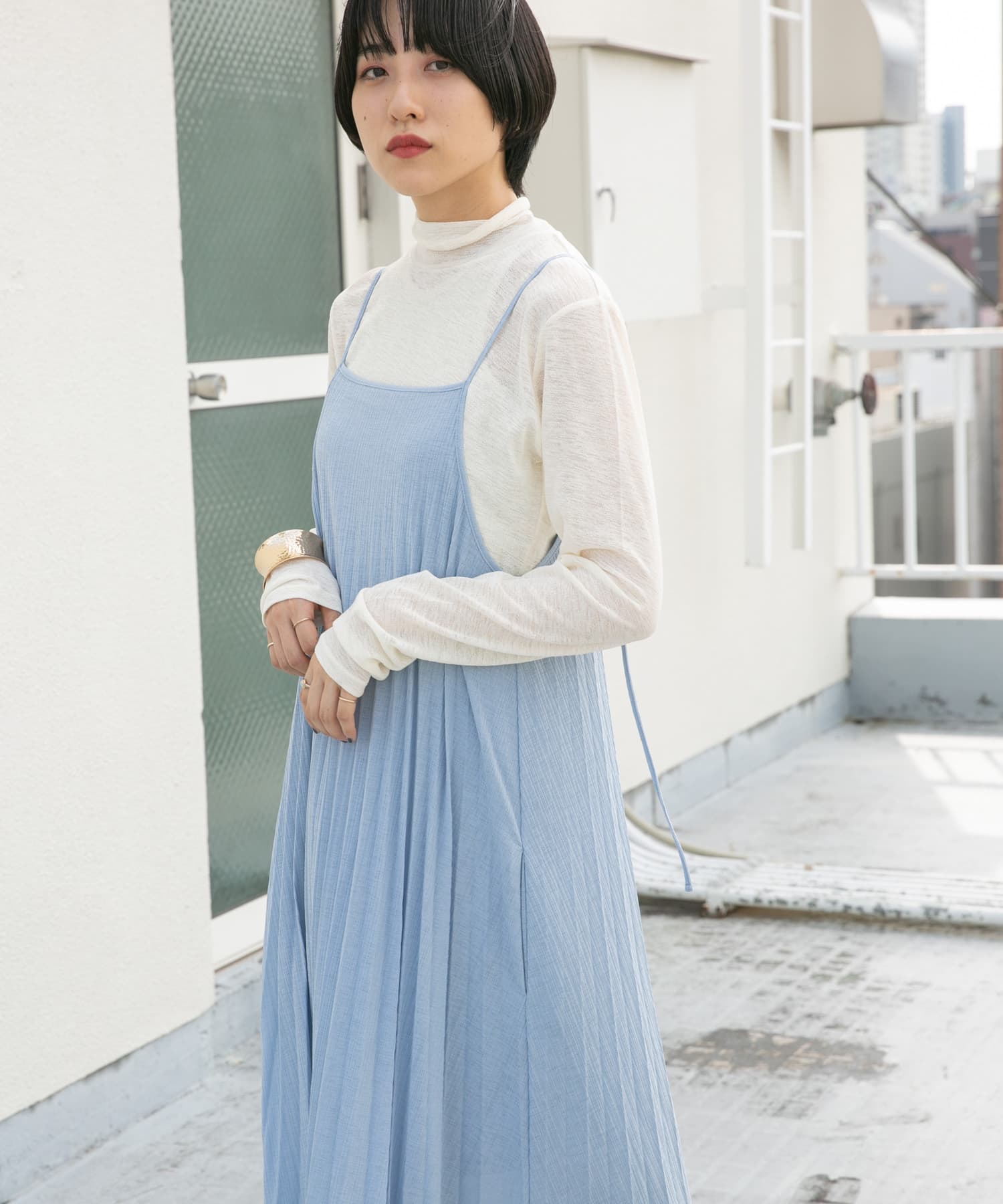 大人気のキャミワンピースが新色を加え再登場!異なる印象を持つ前後2WAY仕様のネックラインは合わせるインナーを選ばずシーズンレスな活躍が期待できる優れもの。エアリーな素材で仕上げたプリーツのフレアデザインが動くたびにひらっとなびくのが魅力的です。アジャスター付きのストラップで長さを調節いただけるのも嬉しいポイント。