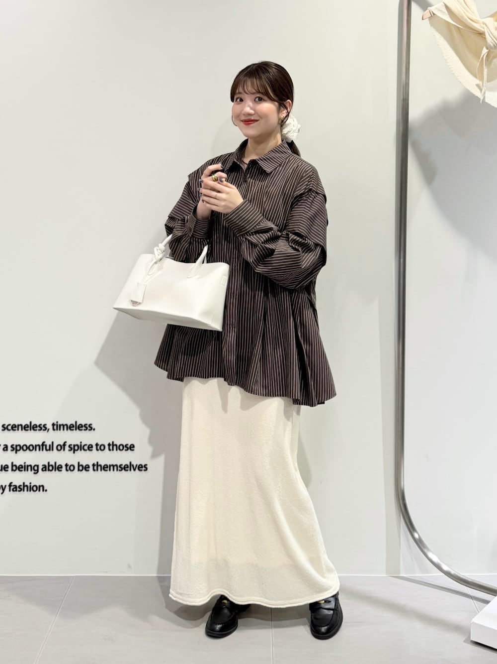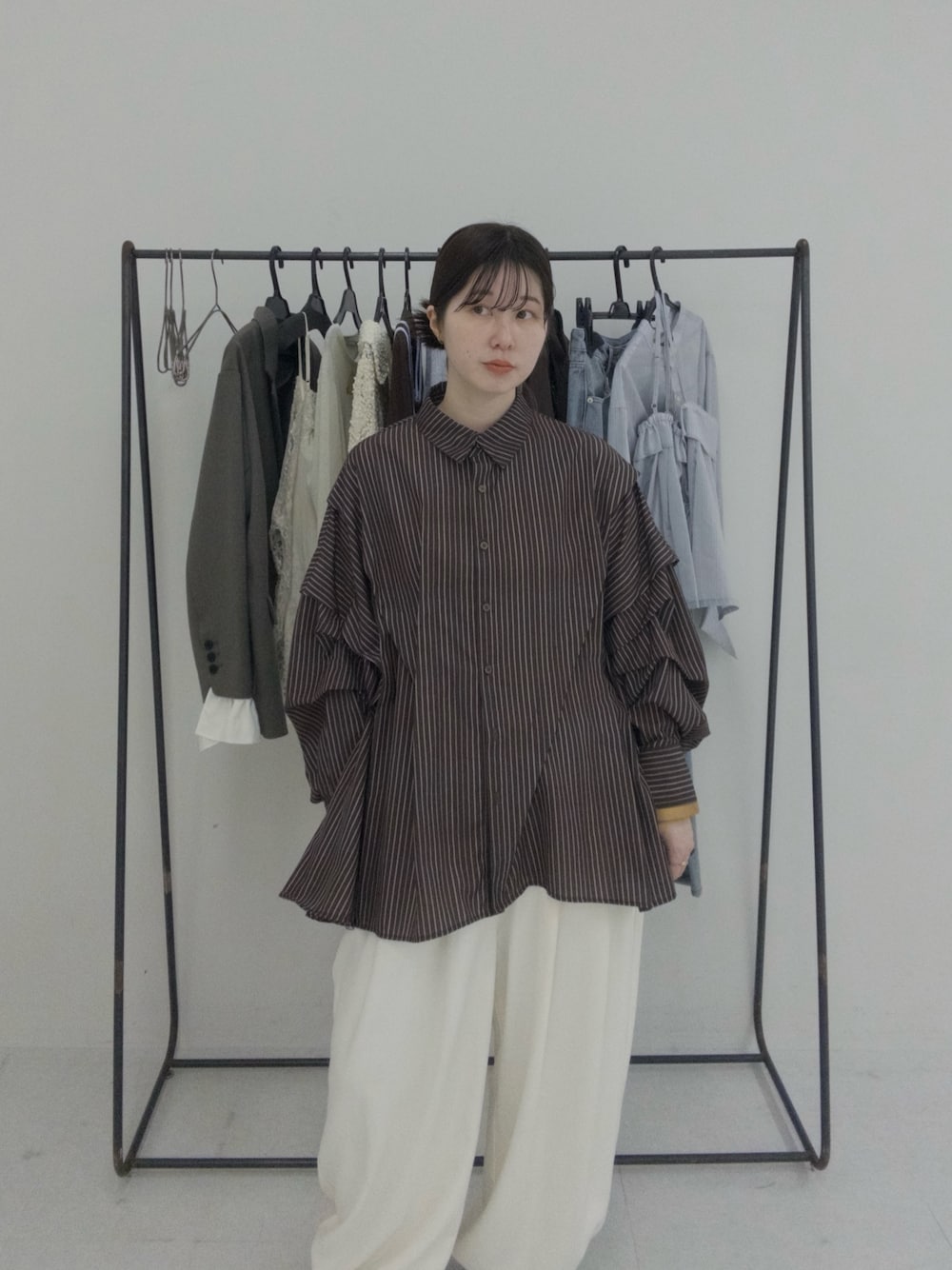 アシンメトリーに施したタックが様々な動きを見せてくれるストライプ柄シャツ。裾に向かってフレアになったシルエットもポイントです。ゆったりとした身幅ながらも、ウエストがシェイプしたように見えます。カジュアルなデニムから女性らしいアイテムまで合わせていただけます。