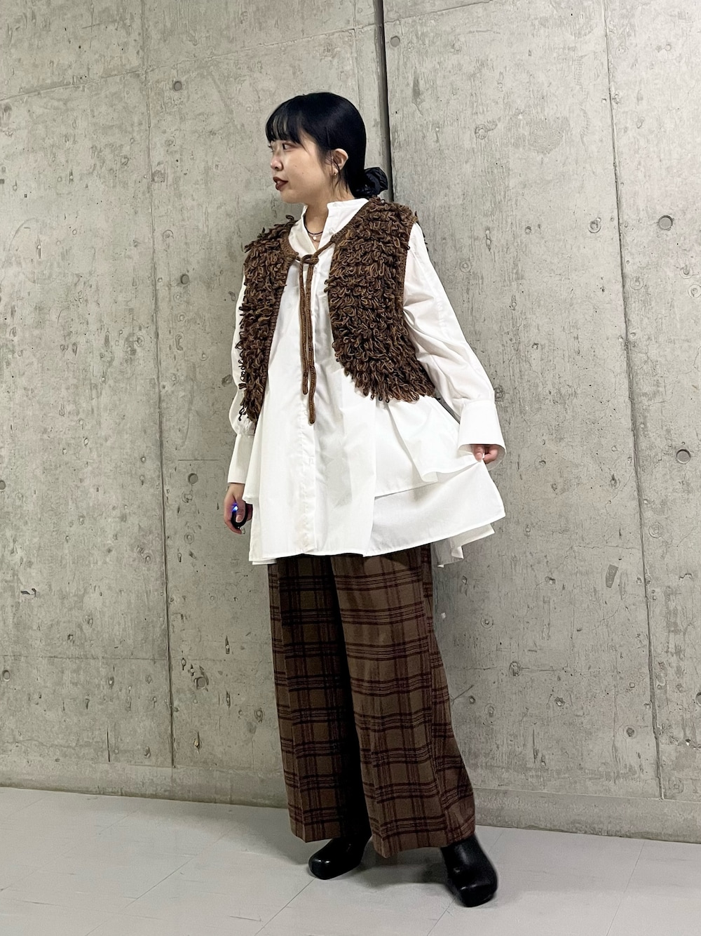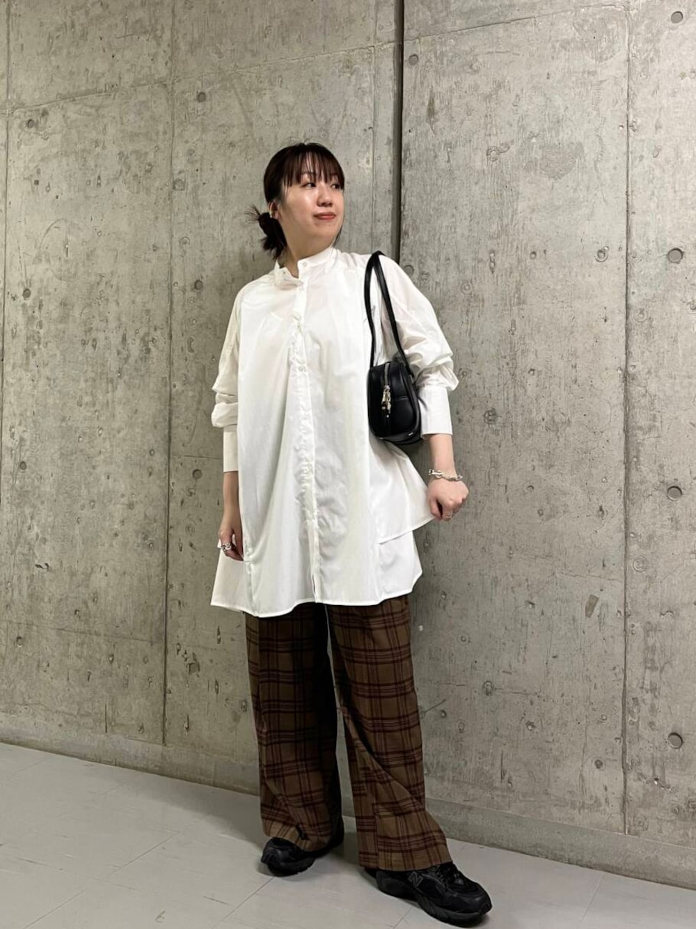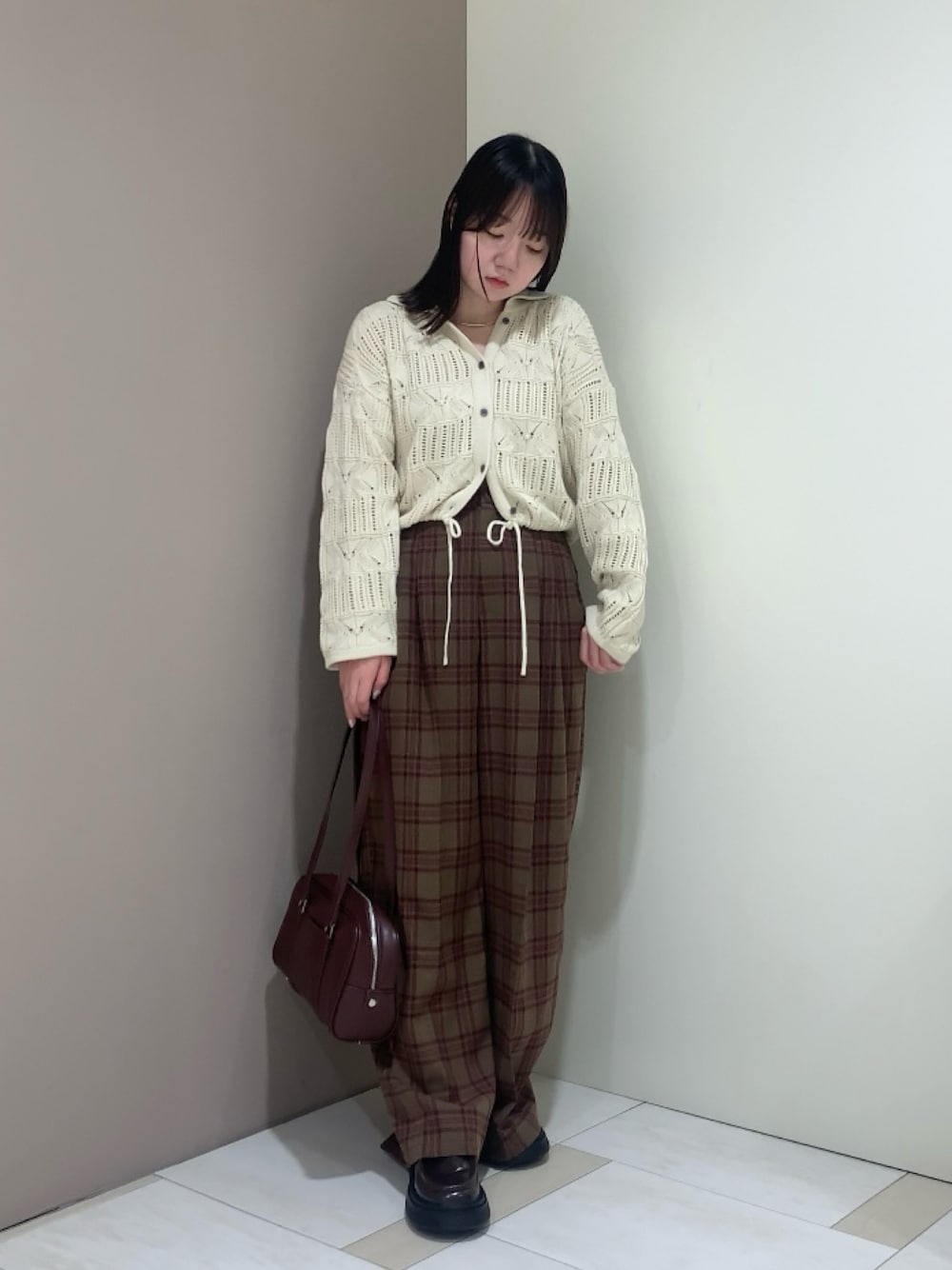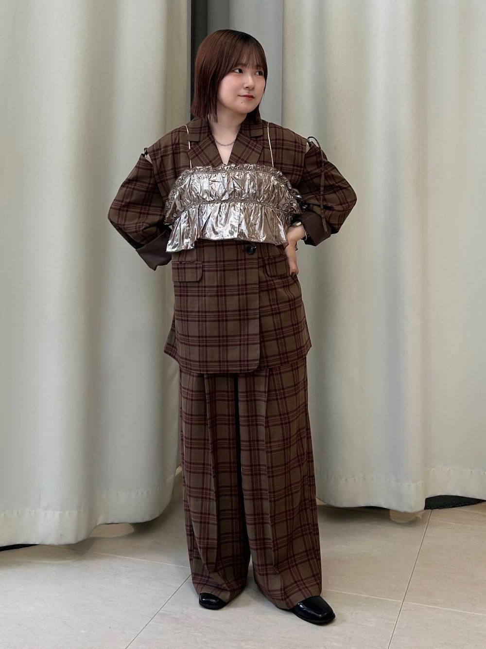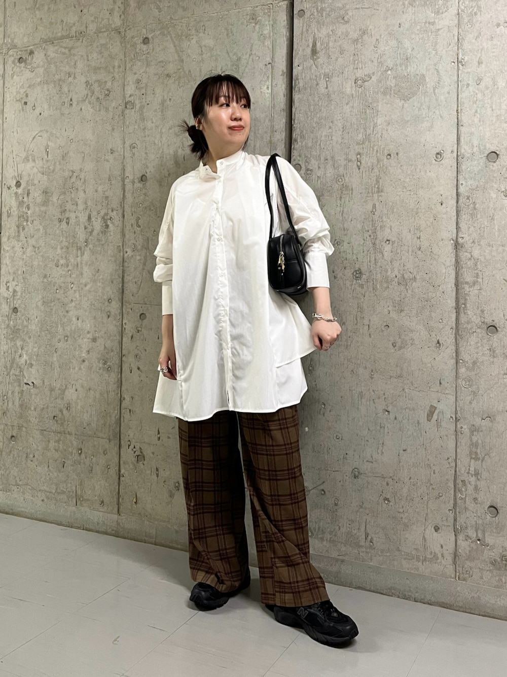 Tシャツからブラウスまで、トップスを選ばずに来ていただけます。タックインするとよりすっきりとした着こなしに◎また、同素材のリムーバルスリーブチェックジャケット(KB46-27J080)とセットアップで合わせるのもおすすめ。