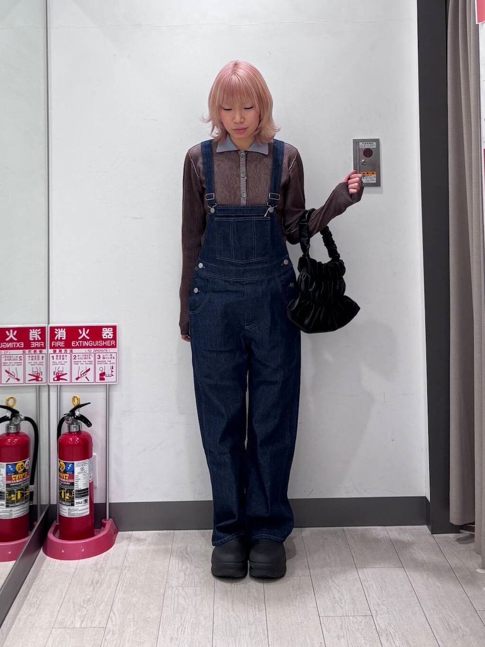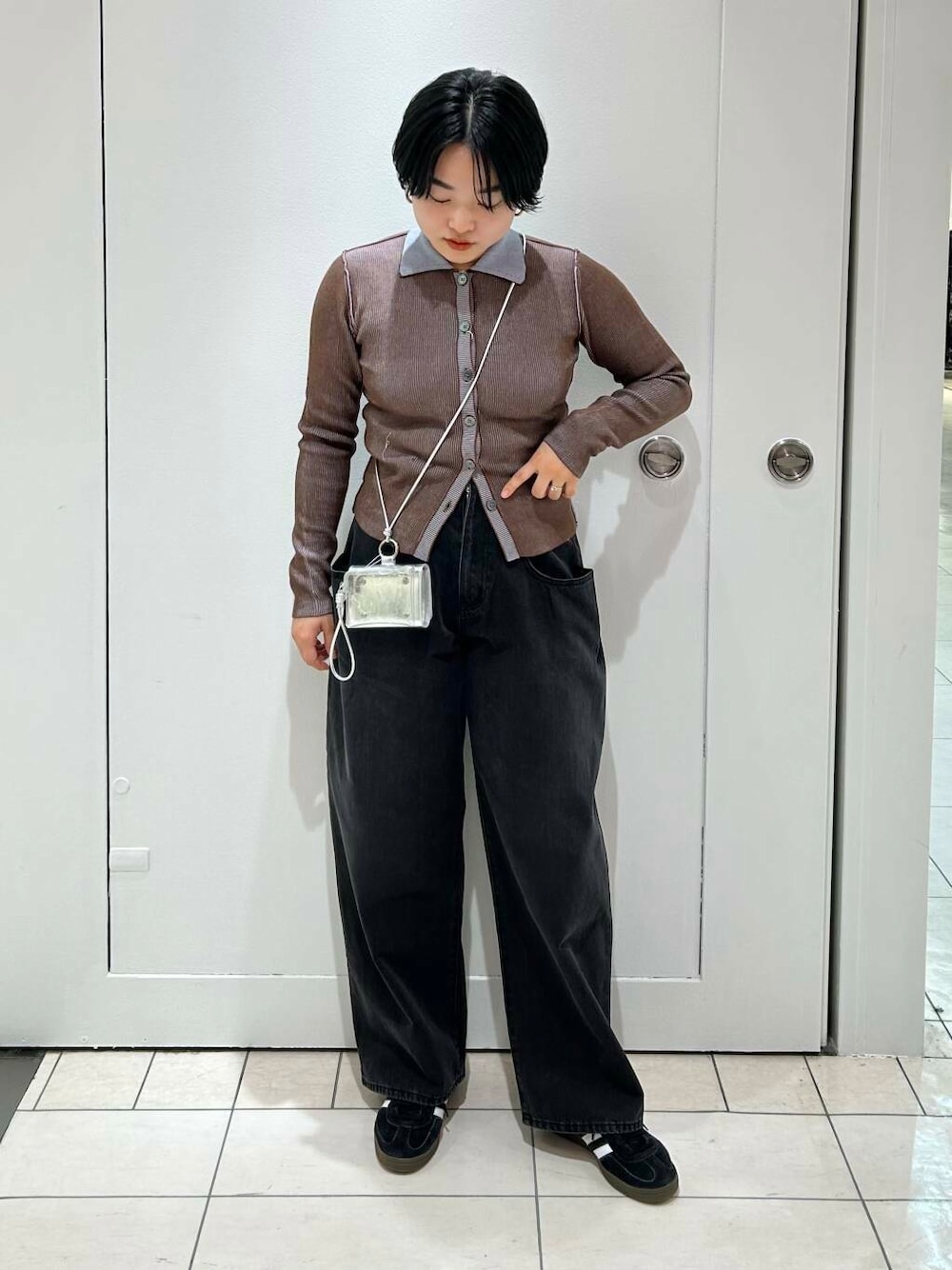 ニット釦を少し開けてボトムのウエスト部分をちらっと見せる着こなしをすると、バランス良く仕上がります。ジャンパースカートにレイヤードしたり、ペインタースラックス(KB46-24R050)を合わせたスタイリングもイチオシ!