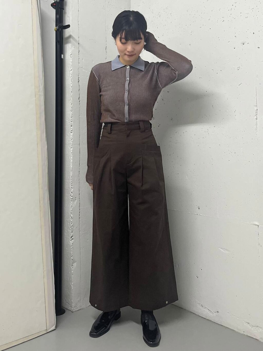 ニット釦を少し開けてボトムのウエスト部分をちらっと見せる着こなしをすると、バランス良く仕上がります。ジャンパースカートにレイヤードしたり、ペインタースラックス(KB46-24R050)を合わせたスタイリングもイチオシ!