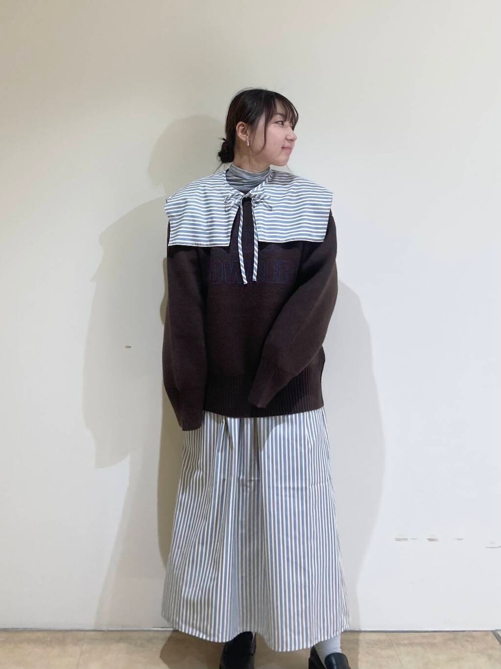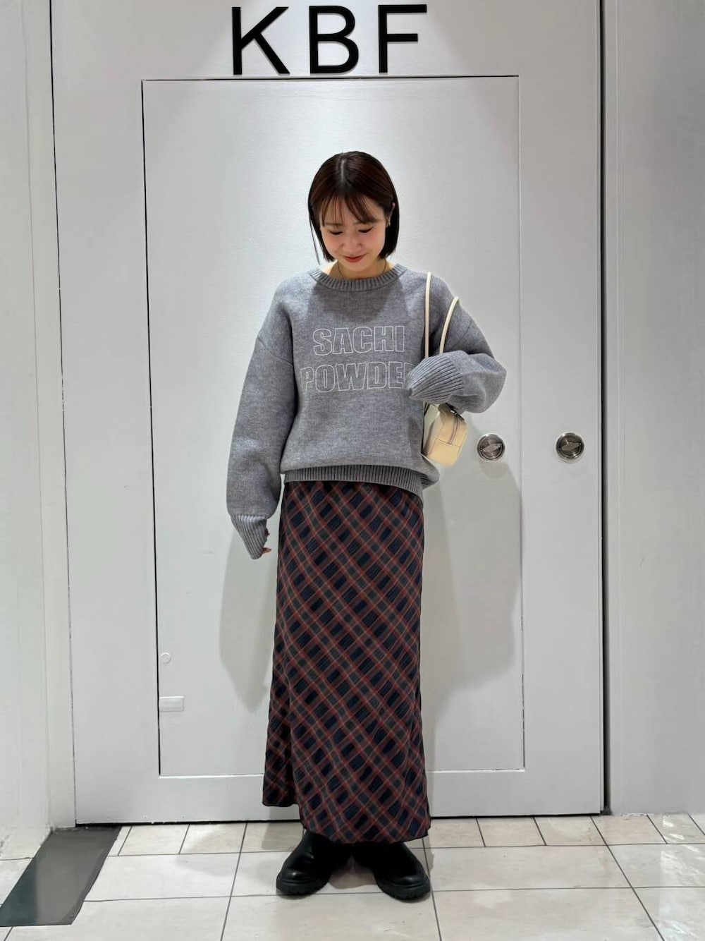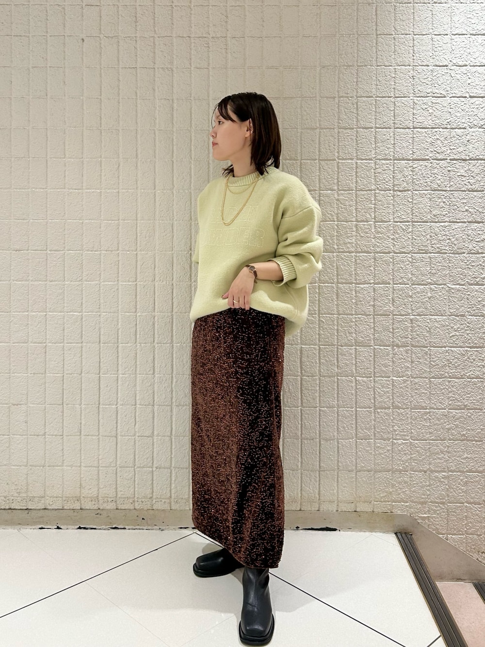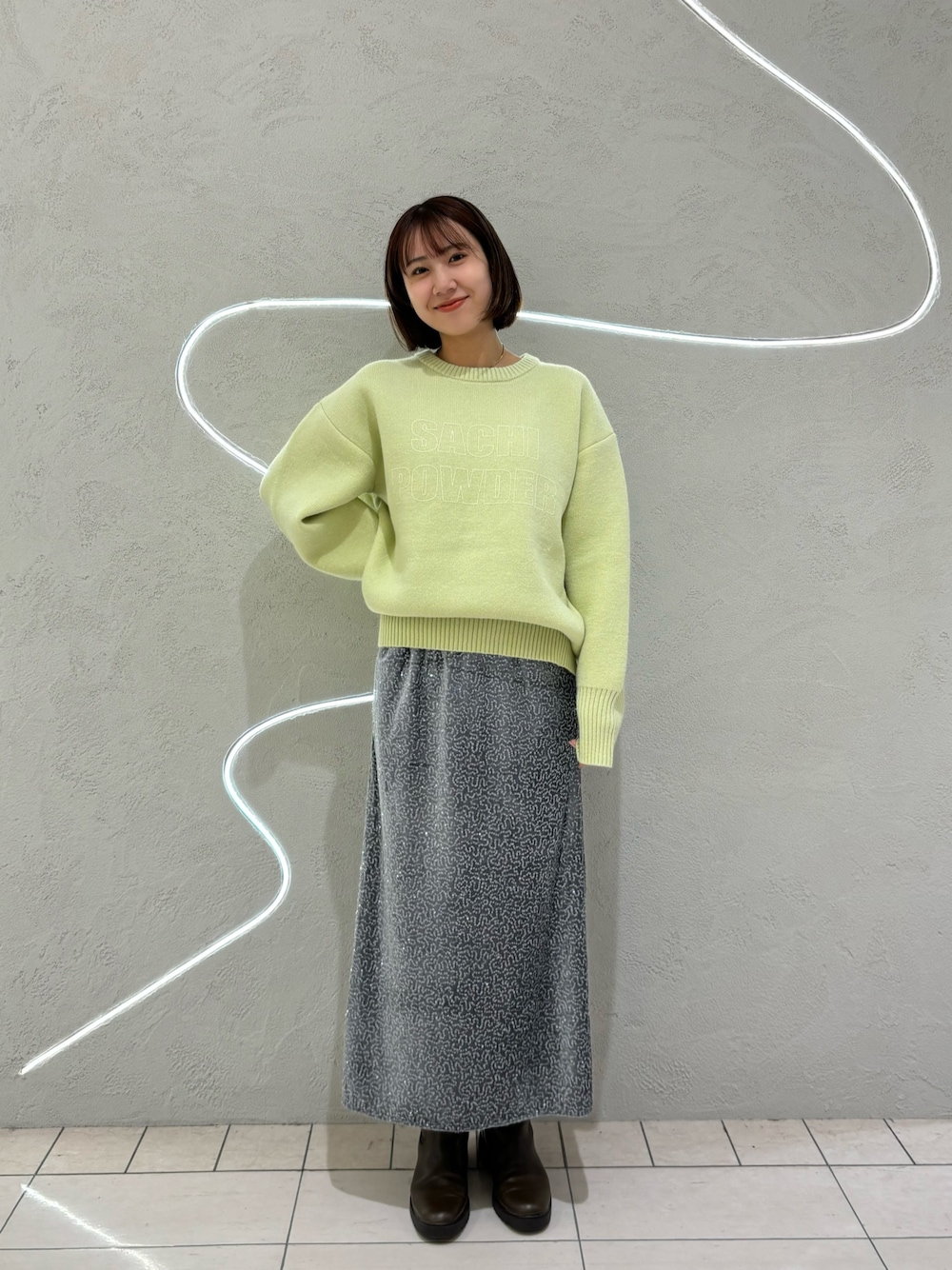 程良いサイジングのニットはIラインシルエットスカートや、すっきりとしたパンツを合わせるとバランスの良い着こなしが叶います。さりげないSACHIPOWDERロゴなので、華やかなスパンコールスカートを穿いても自然と馴染みます。
