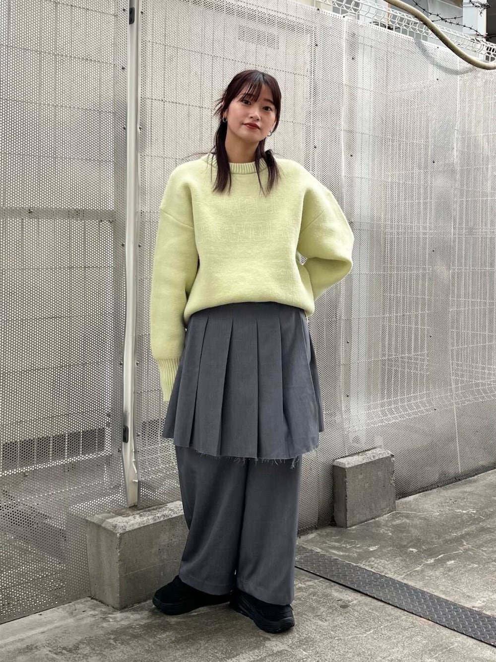 程良いサイジングのニットはIラインシルエットスカートや、すっきりとしたパンツを合わせるとバランスの良い着こなしが叶います。さりげないSACHIPOWDERロゴなので、華やかなスパンコールスカートを穿いても自然と馴染みます。