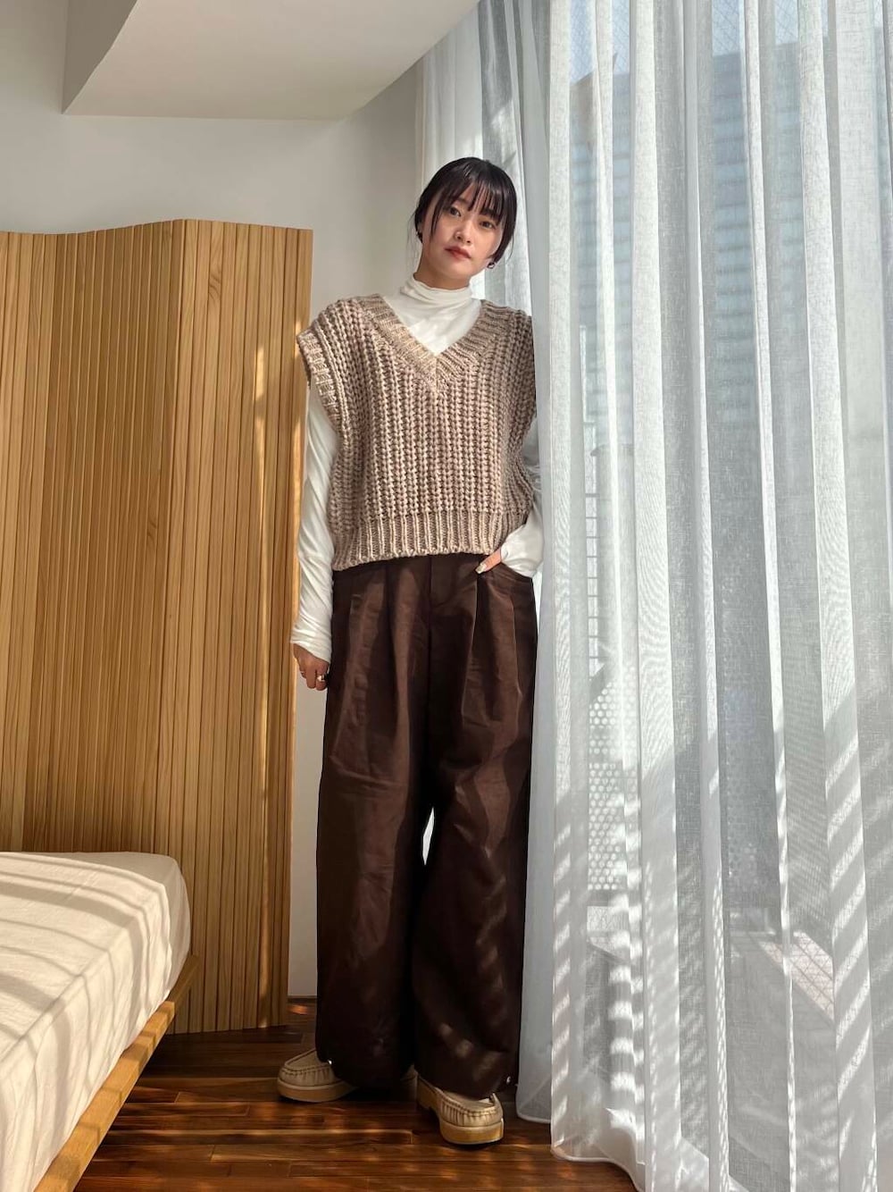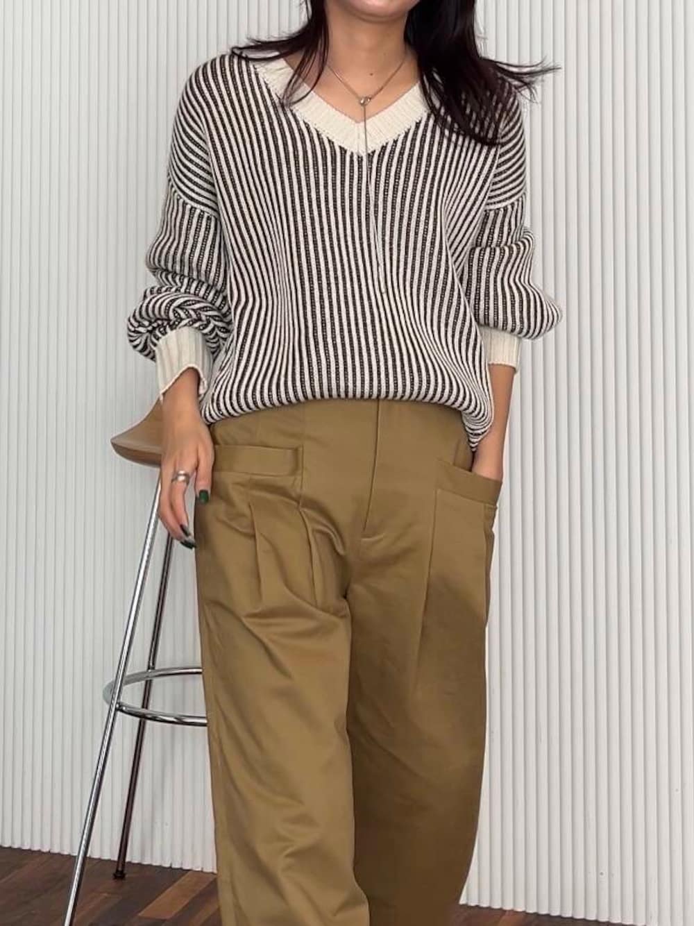 ボリュームのあるパンツはマルチビスチェSETカーディガン(KB47-22F240)と合わせるのがイチオシ!もちろん、トップスをタックインしたりコンパクトなアイテムを着るとよりすっきりとした着こなしができます。