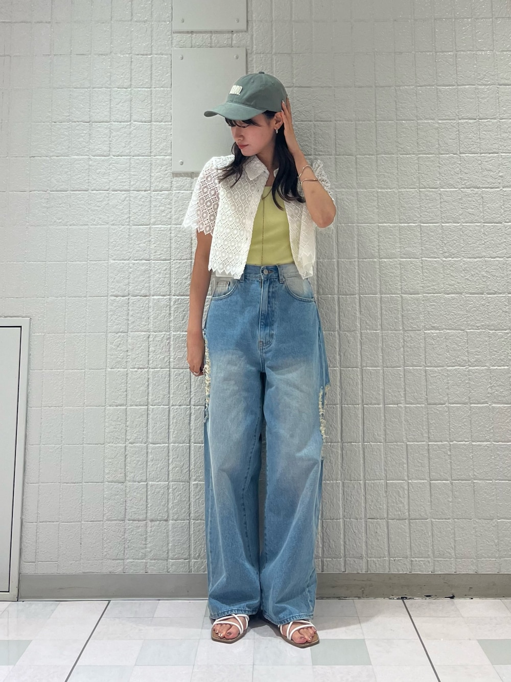 コンパクトなトップスを合わせるとデニムのボリューム感とバランスが◎カジュアルなボトムなので、デザイン性のあるベストや女性らしいトップスを合わせるのもおすすめ。