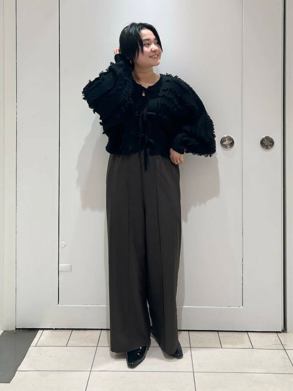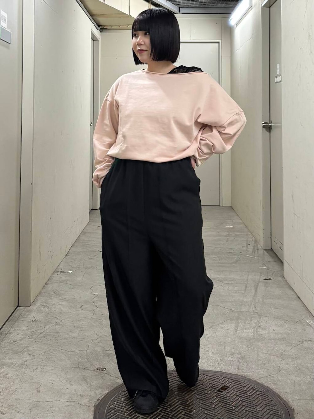 ウエストぐるりゴム仕様で、リラクシーな履き心地が期待できるパンツ。一見ベーシックに見えますが、切替部分を断ち切り仕様に仕上げました。ワイドシルエットでメンズっぽさも演出してます。合わせるアイテム次第でロングスパン活躍する1本です。