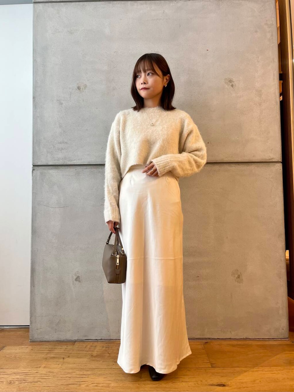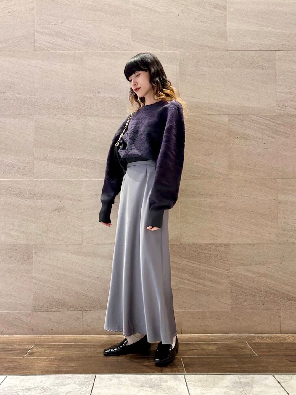 ボリュームのあるニットと相性が良く、ブラウスを合わせるとより女性らしさが引き立ちます。カジュアルなスウェットやニットカーディガンともマッチします。