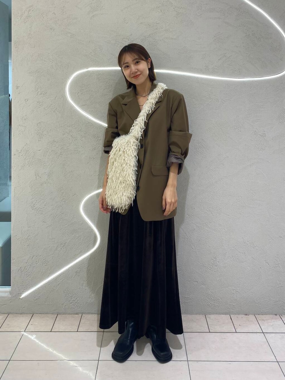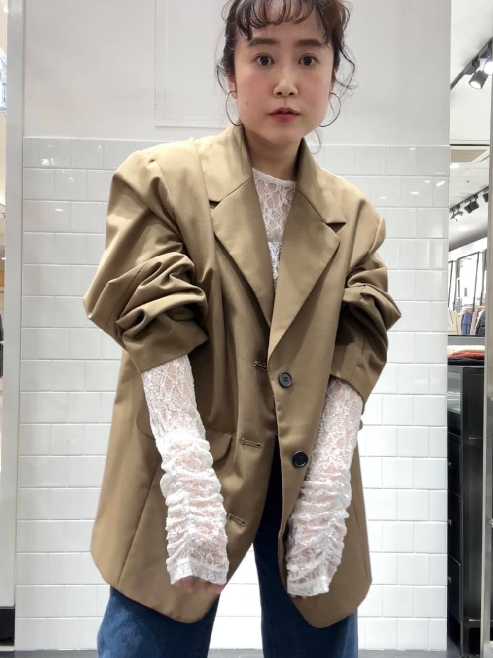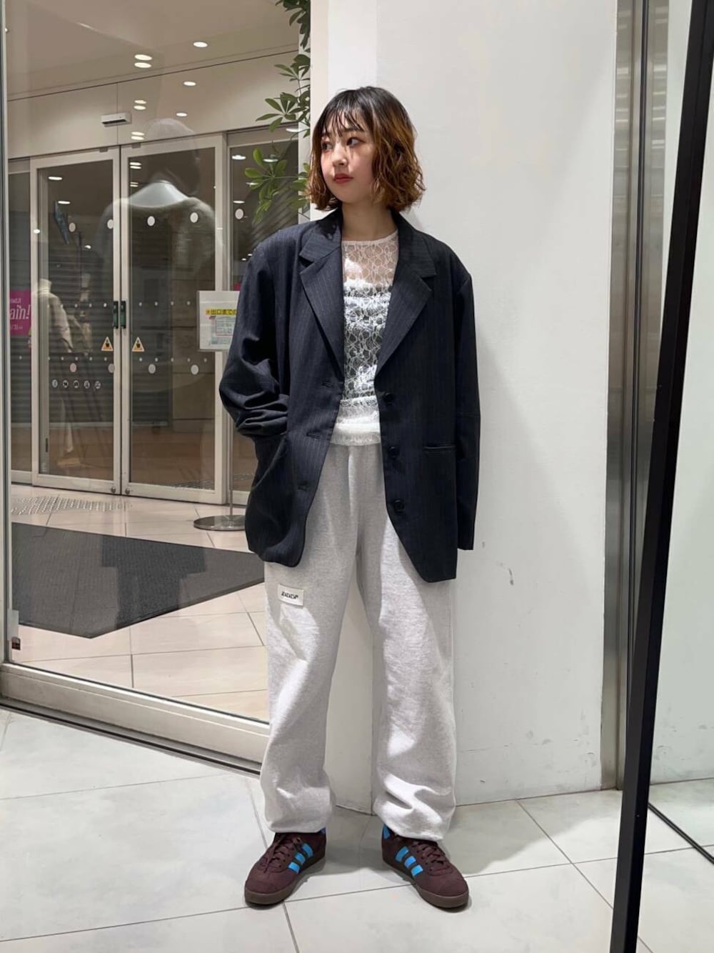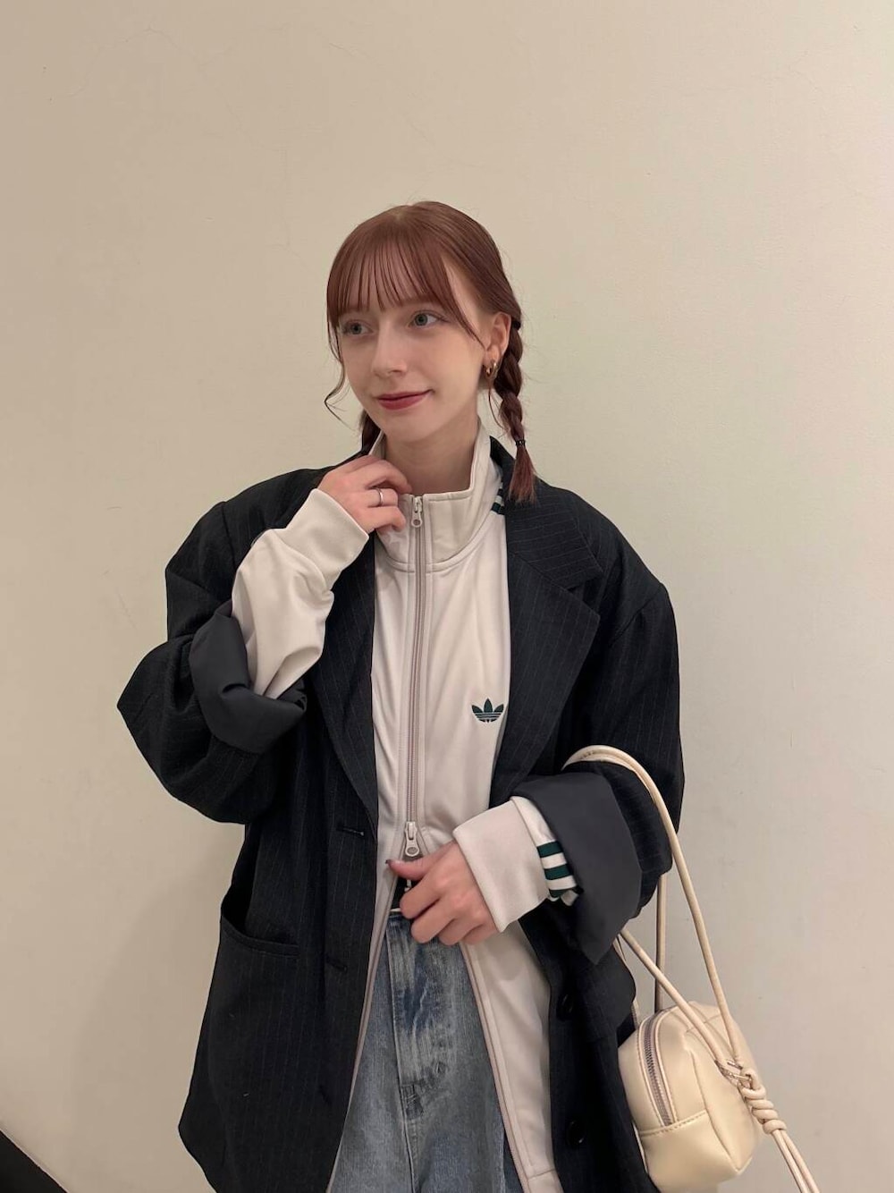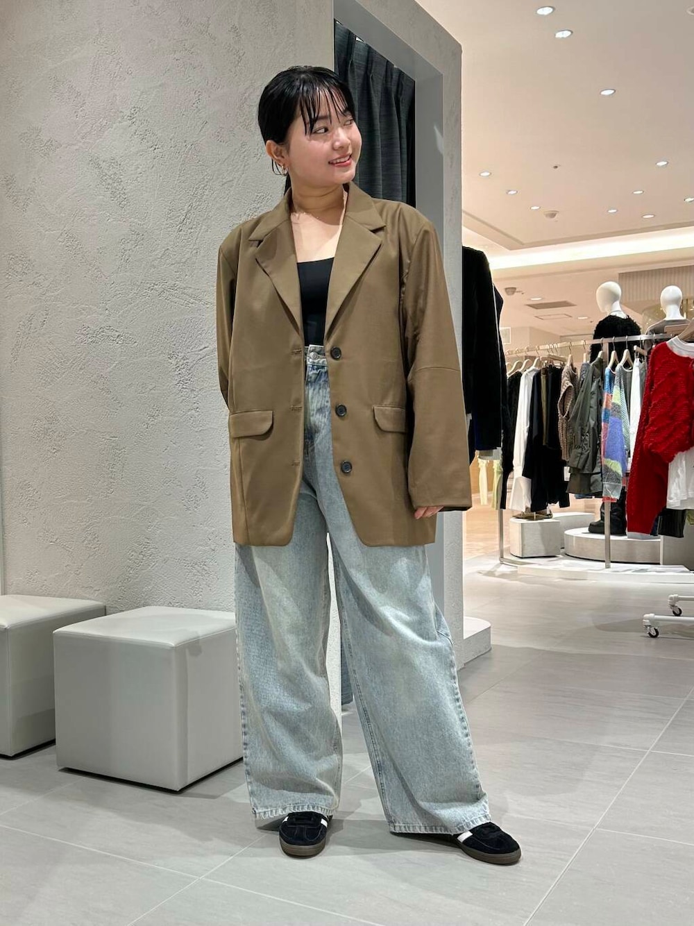 同素材のタックストレートスラックス(KB47-24F190)とセットアップの着用ができ、デニムを合わせるとグランパスタイルが完成。インナーにラッフルカラーブラウス(KB47-23F170)を着た女性らしいスタイルも◎
