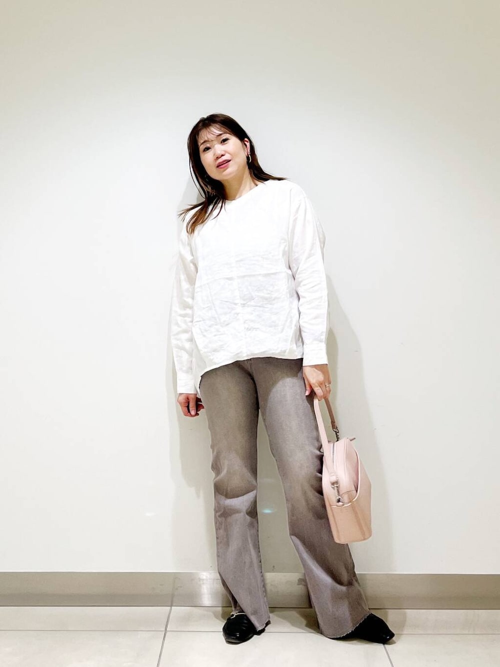シンプルなカットソーを合わせれば、デニムのシルエットが際立つスタイルに。ブラウスやレースアイテムを着ると甘めな大人カジュアルコーデが叶います。