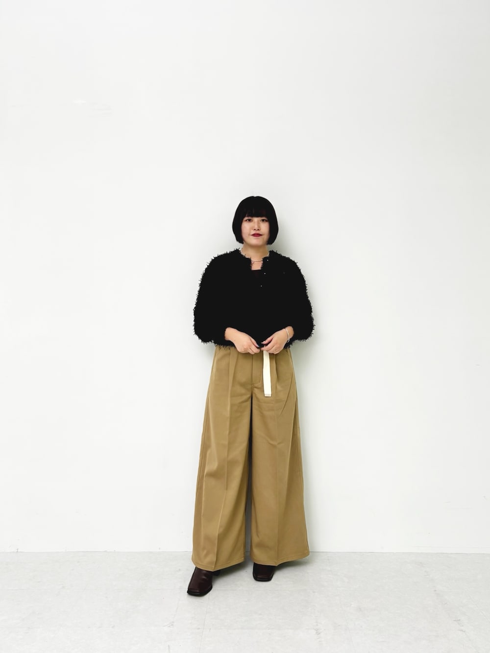ワイドスラックスとガチャベルトがセットになったアイテム。パンツはタックとセンタープレスが入っているので、スタイルアップ効果を発揮し、高見えするツイル生地を使用しています。後ろのポケットやステッチワークが程よいカジュアルさを演出します。1本持っておくと便利なアイテムです。