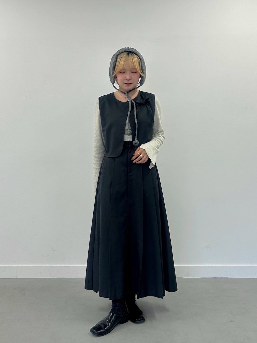 前後2WAY仕様のトップスと、美シルエットにこだわったスカートがセットになったワンピース。トップスはフロントの開きやリボンディテール、スカートはベルトループとポケット付きなど、別々でも着回せるように仕上げました。合わせるインナー次第でロングスパンの活躍が叶い、セットで着ていただくと抜け感のある着こなしが実現します。