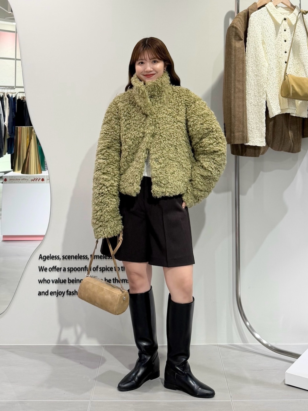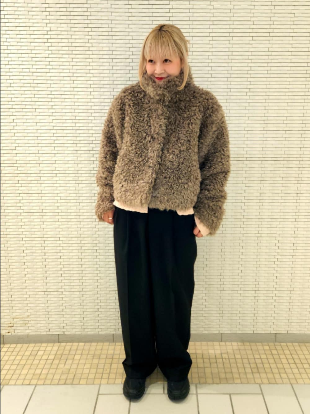 インパクトのあるボア素材が特徴的なジャケット。ボリュームがあるのでデザインはシンプルにしつつ、少しフォルム感を出しました。衿部分はスタンドネックとしても使用でき、スナップ釦やお洋服に合わせやすいカラーバリエーションもポイントです。この冬持っておきたい存在感を放つアウターです。