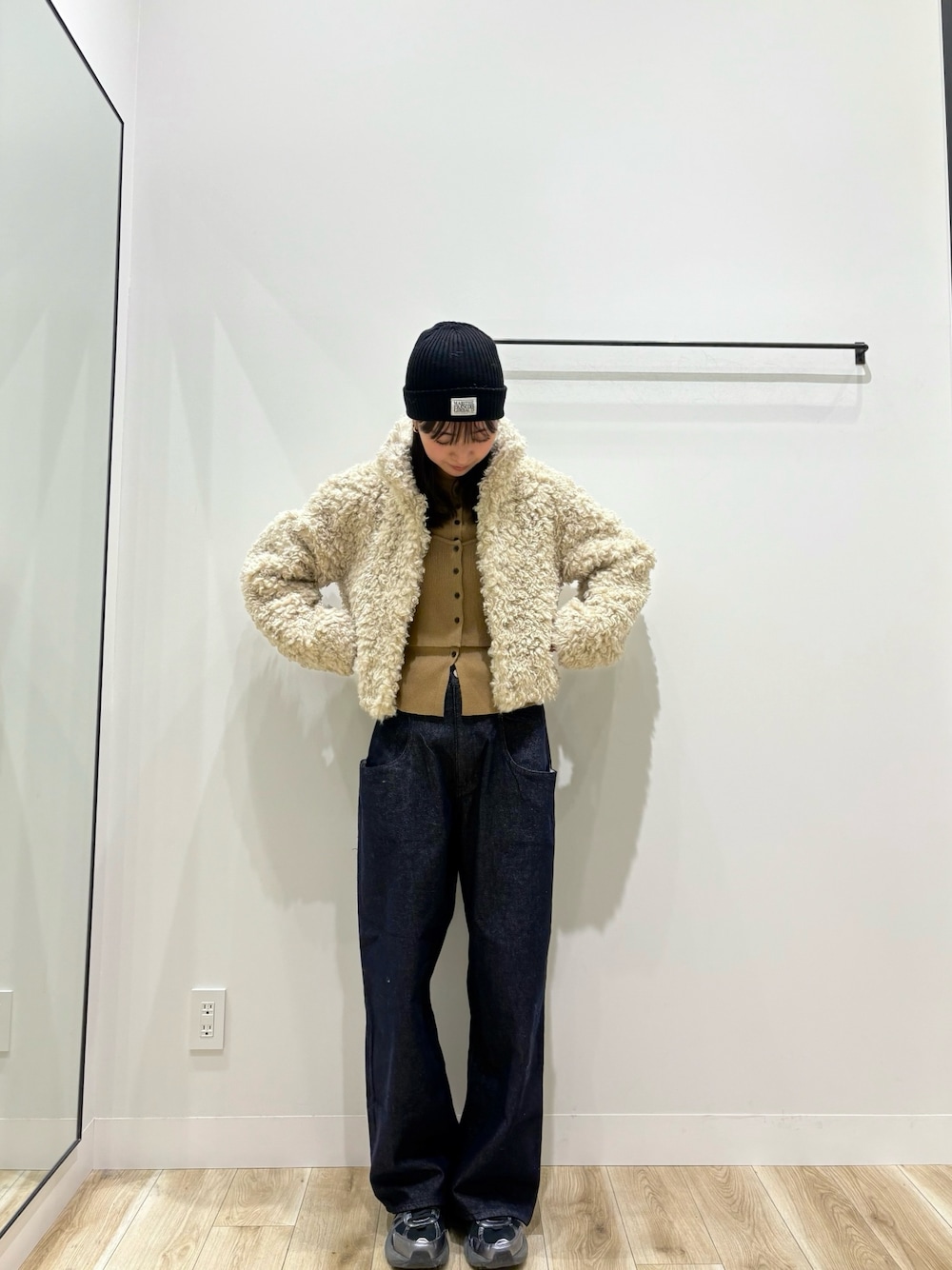 インパクトのあるボア素材が特徴的なジャケット。ボリュームがあるのでデザインはシンプルにしつつ、少しフォルム感を出しました。衿部分はスタンドネックとしても使用でき、スナップ釦やお洋服に合わせやすいカラーバリエーションもポイントです。この冬持っておきたい存在感を放つアウターです。
