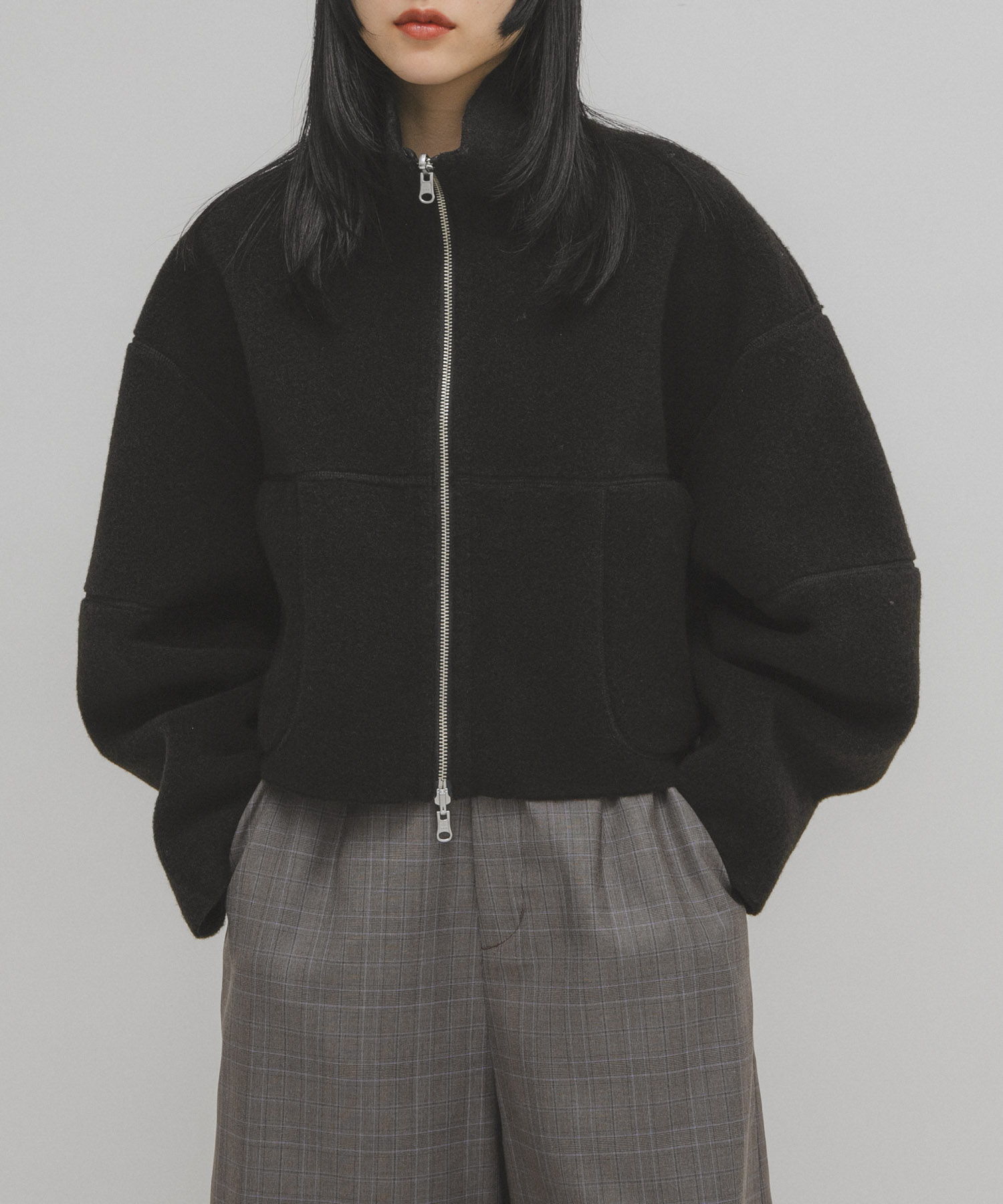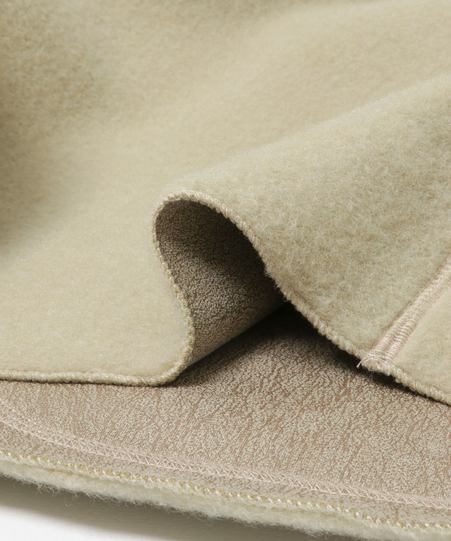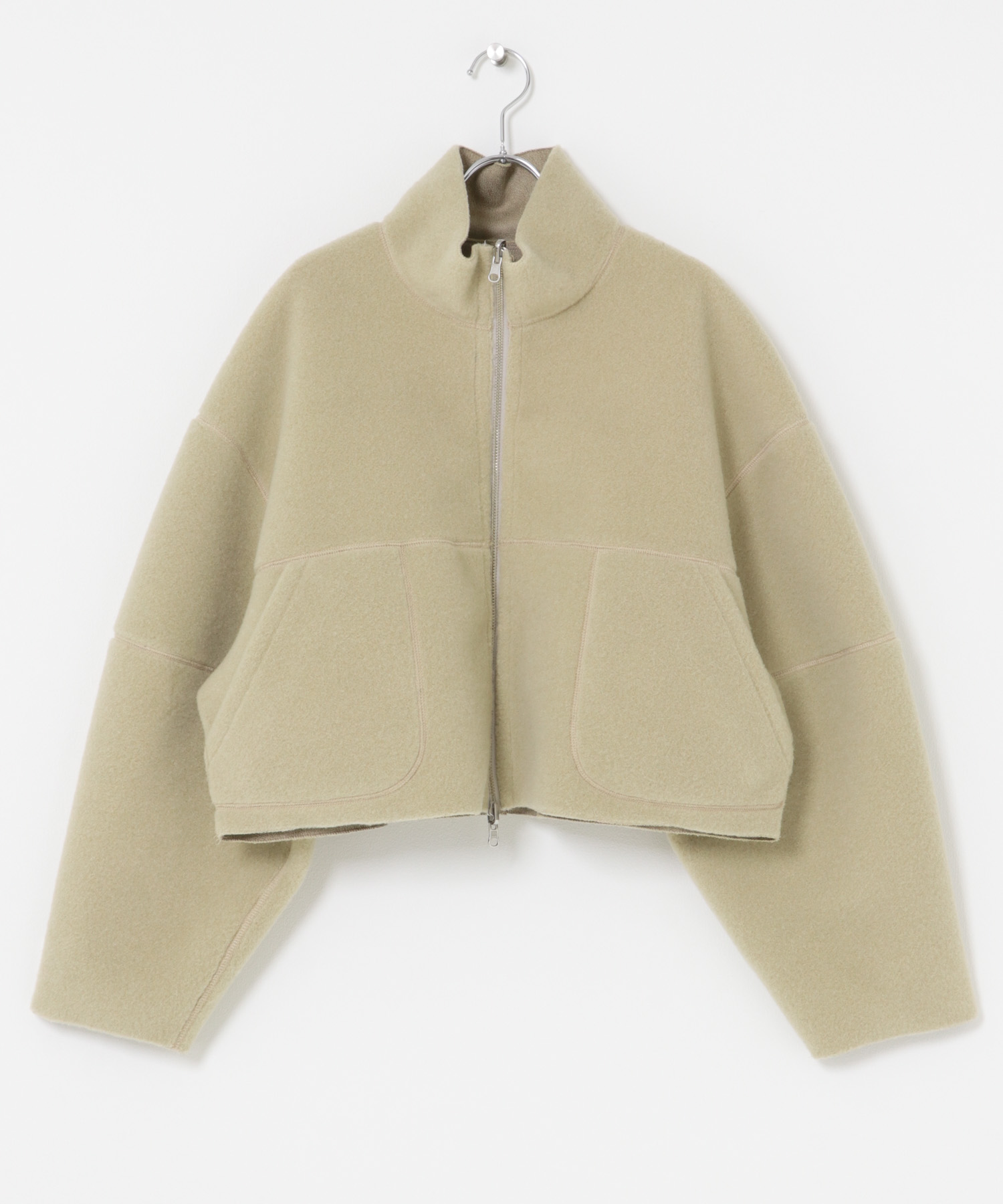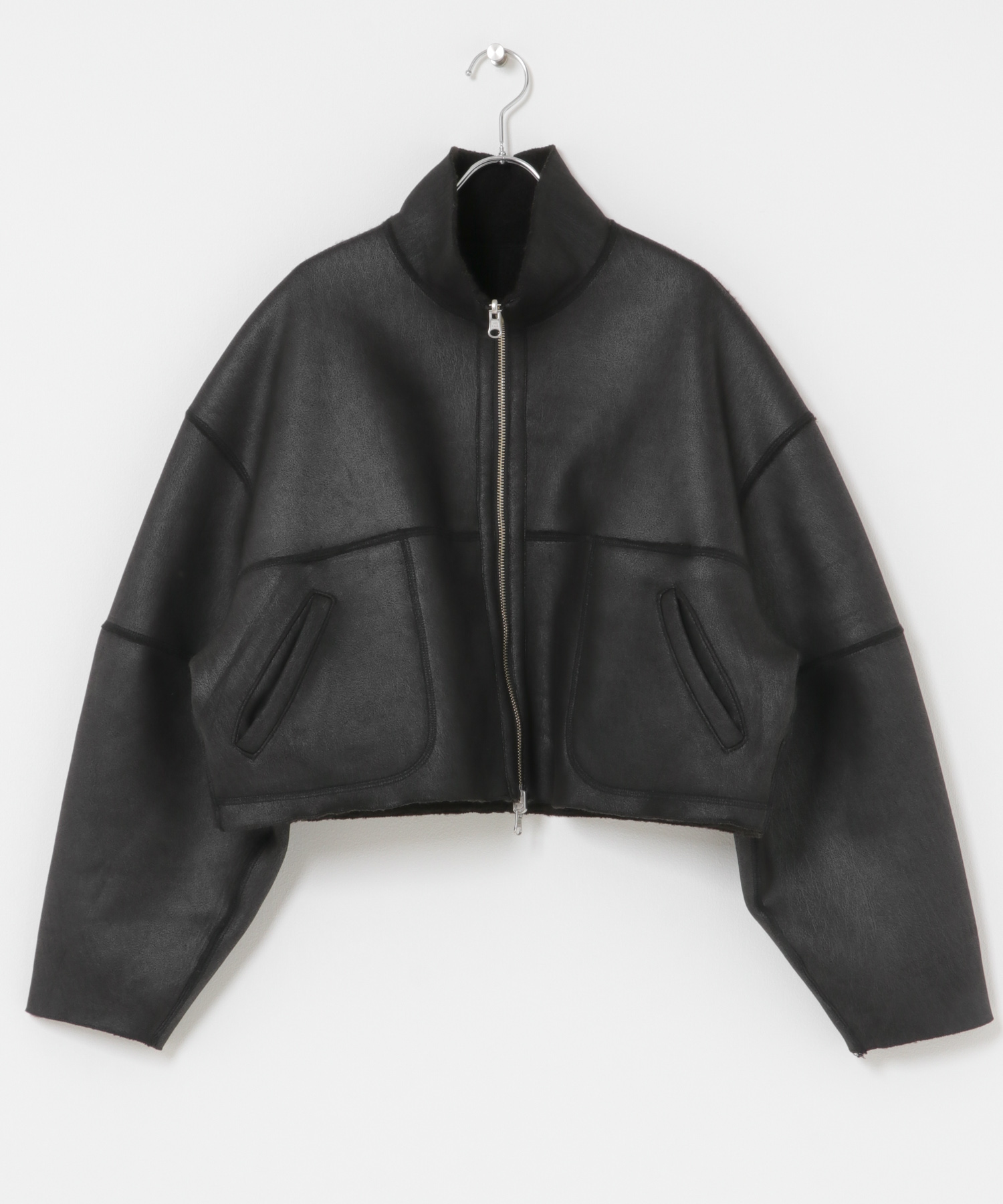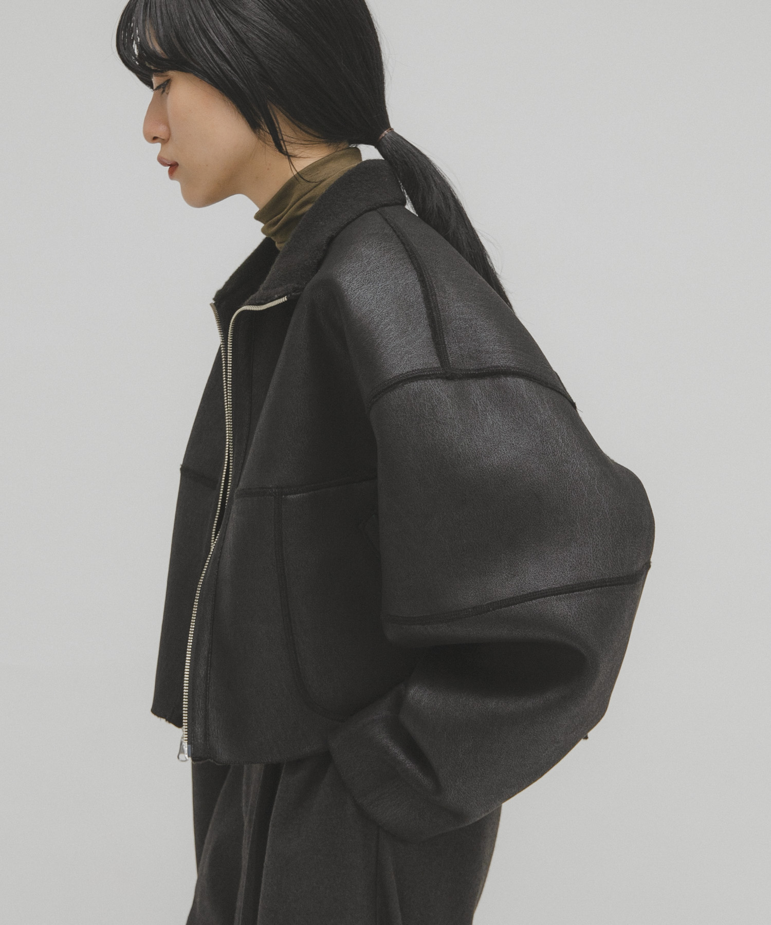 目の細かいボアと、フェイクレザーのどちらも楽しめるリバーシブル仕様になったアウター。立体的なボリュームスリーブが特徴的で、モードな印象ながらも柔らかく着膨れしないところが嬉しいポイントです。ショート丈なのでボリュームのあるボトムを合わせると、バランスの良いスタイリングが叶います。