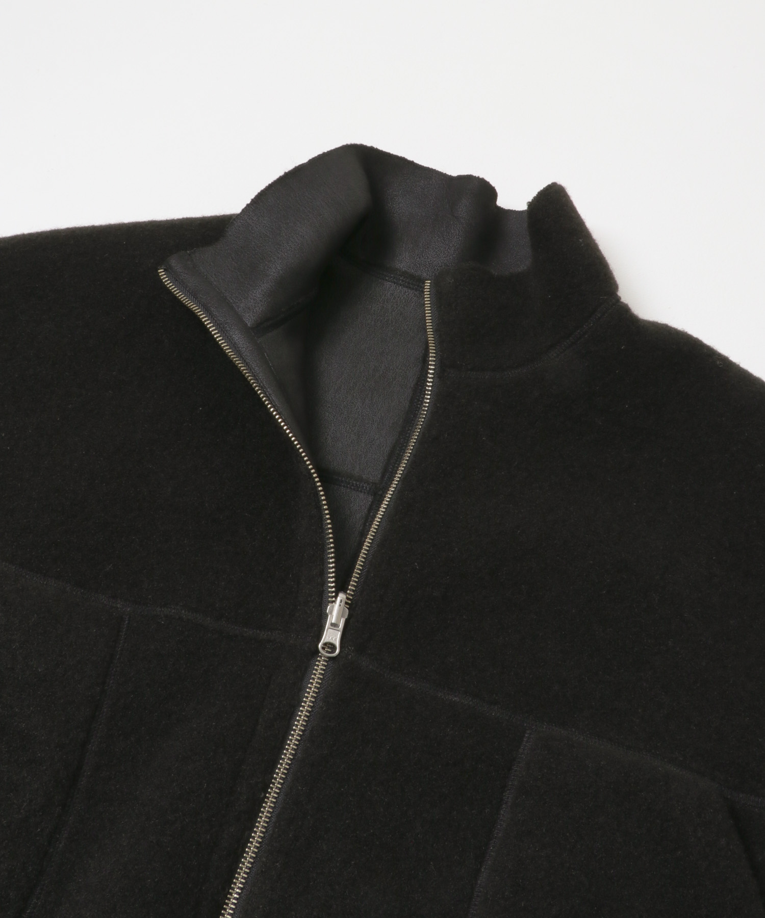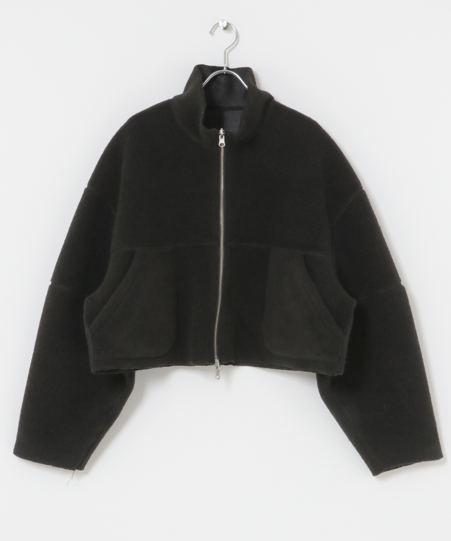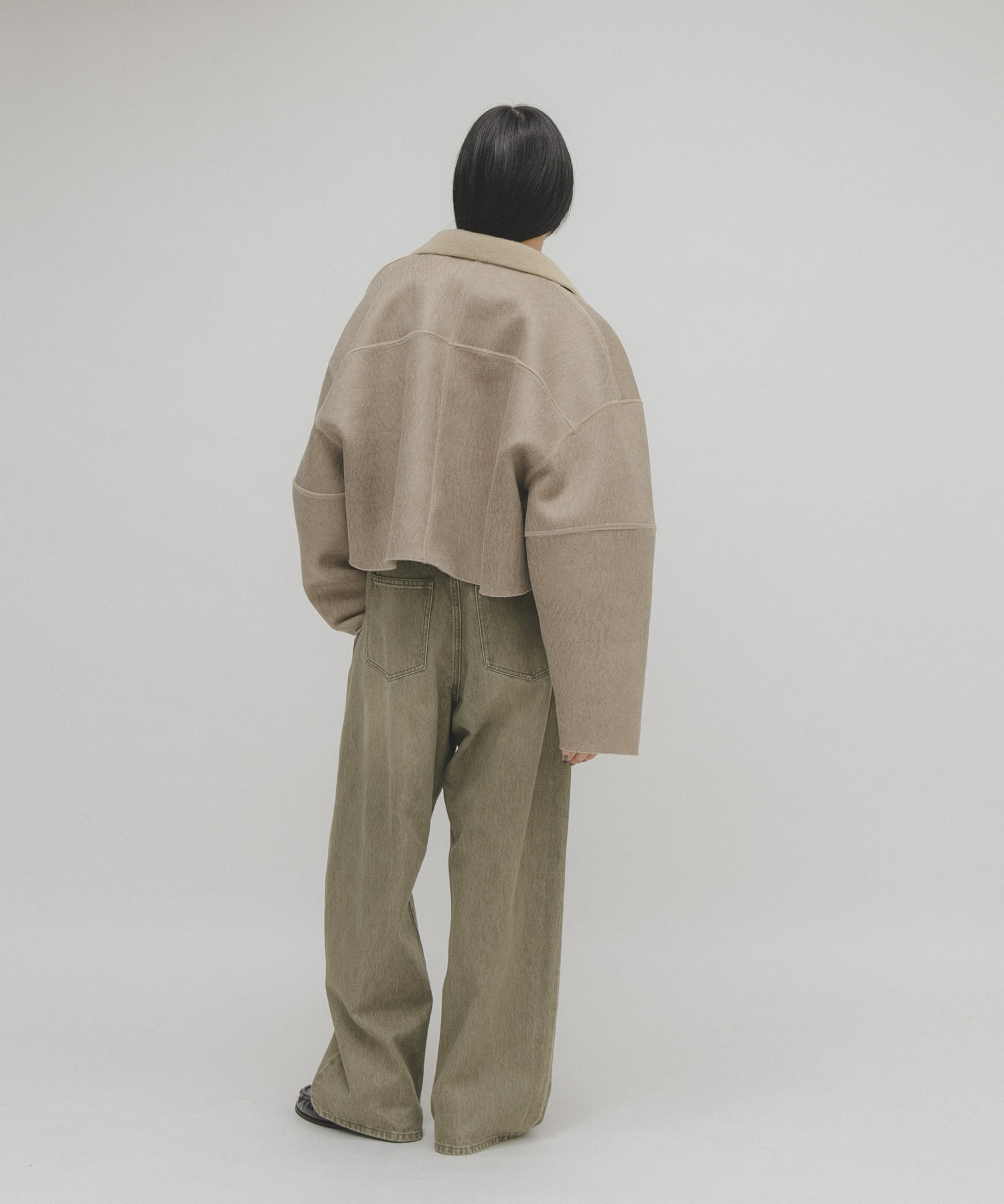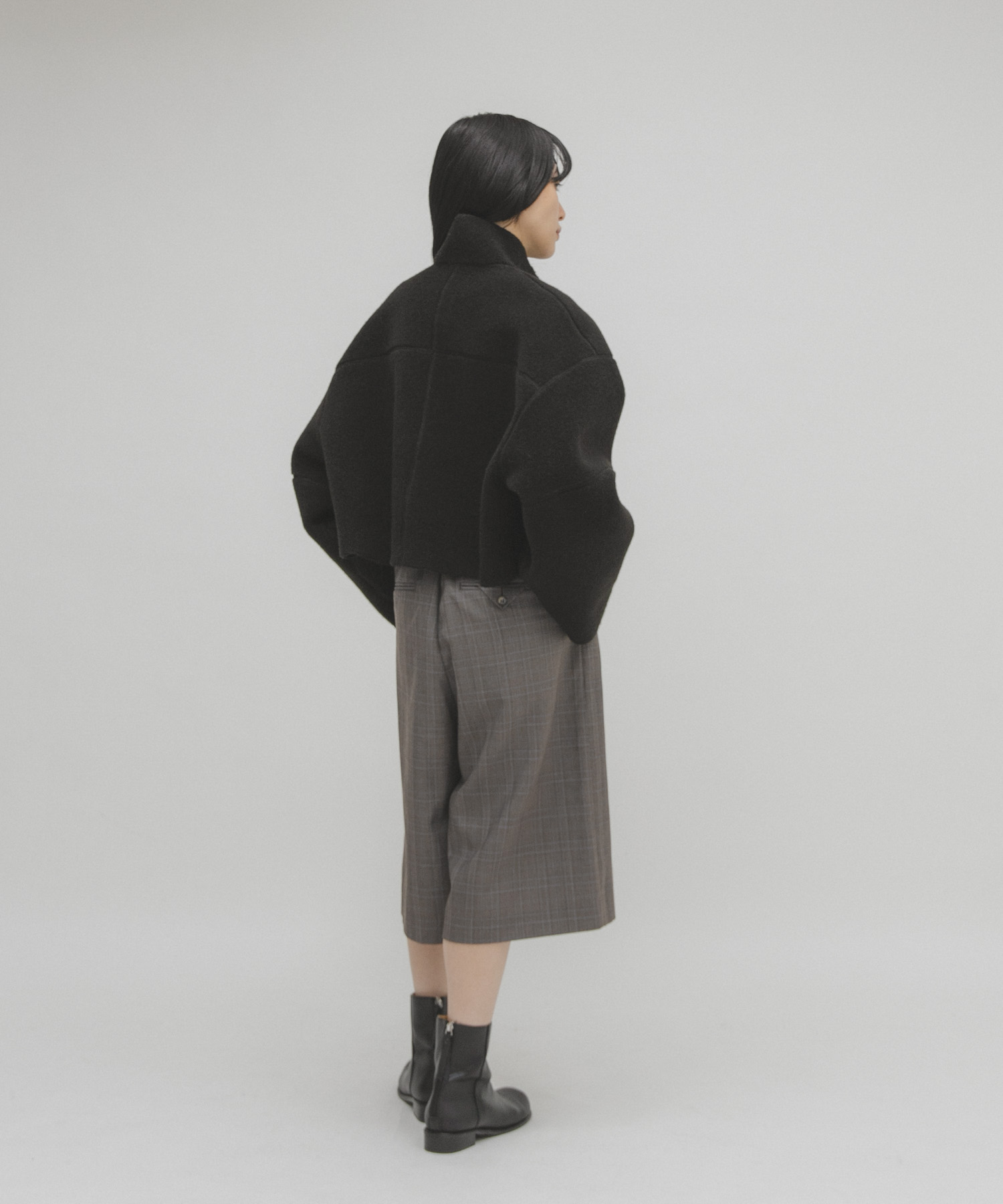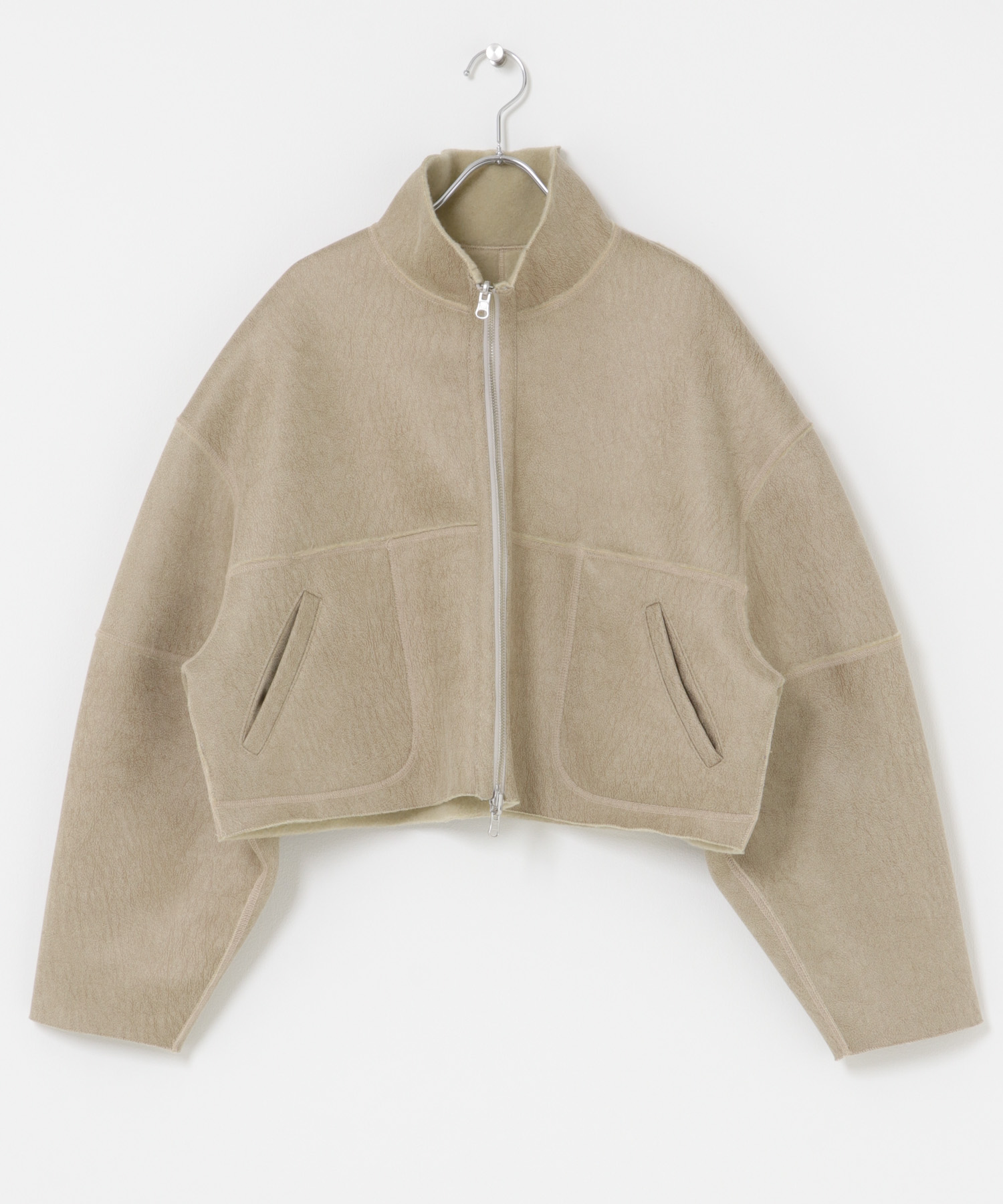 目の細かいボアと、フェイクレザーのどちらも楽しめるリバーシブル仕様になったアウター。立体的なボリュームスリーブが特徴的で、モードな印象ながらも柔らかく着膨れしないところが嬉しいポイントです。ショート丈なのでボリュームのあるボトムを合わせると、バランスの良いスタイリングが叶います。