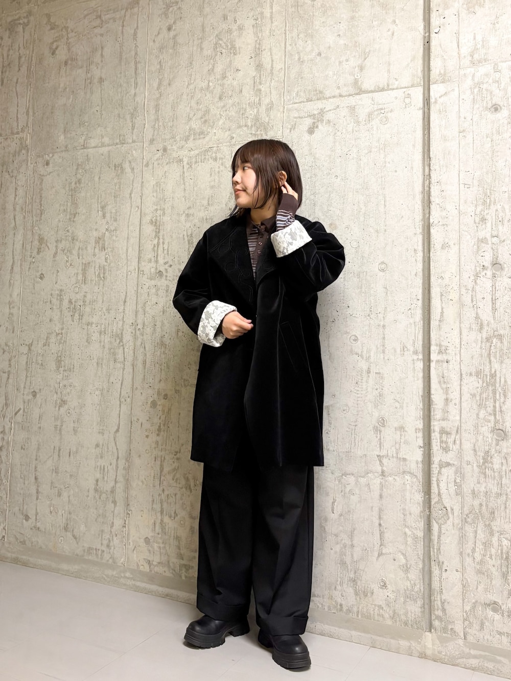 シーズンムード高まるベロア素材を使用したBIGジャケット。胸元の立体ステッチが特徴的で、袖口は2WAYになっており、折り返すとヴィンテージライクなレースが現れます。腰回りまでの長さがあり、程よく厚みがあるので防寒も叶えるアイテムです。