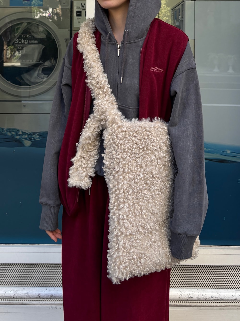 くるくるとした毛足のボア素材を使用した大きめのBAG。ショルダーは本体に付いているループを通し長さ調整ができる仕様にしております。存在感がしっかりとあるので、スタイリングのワンポイントにぴったりなアイテムです。