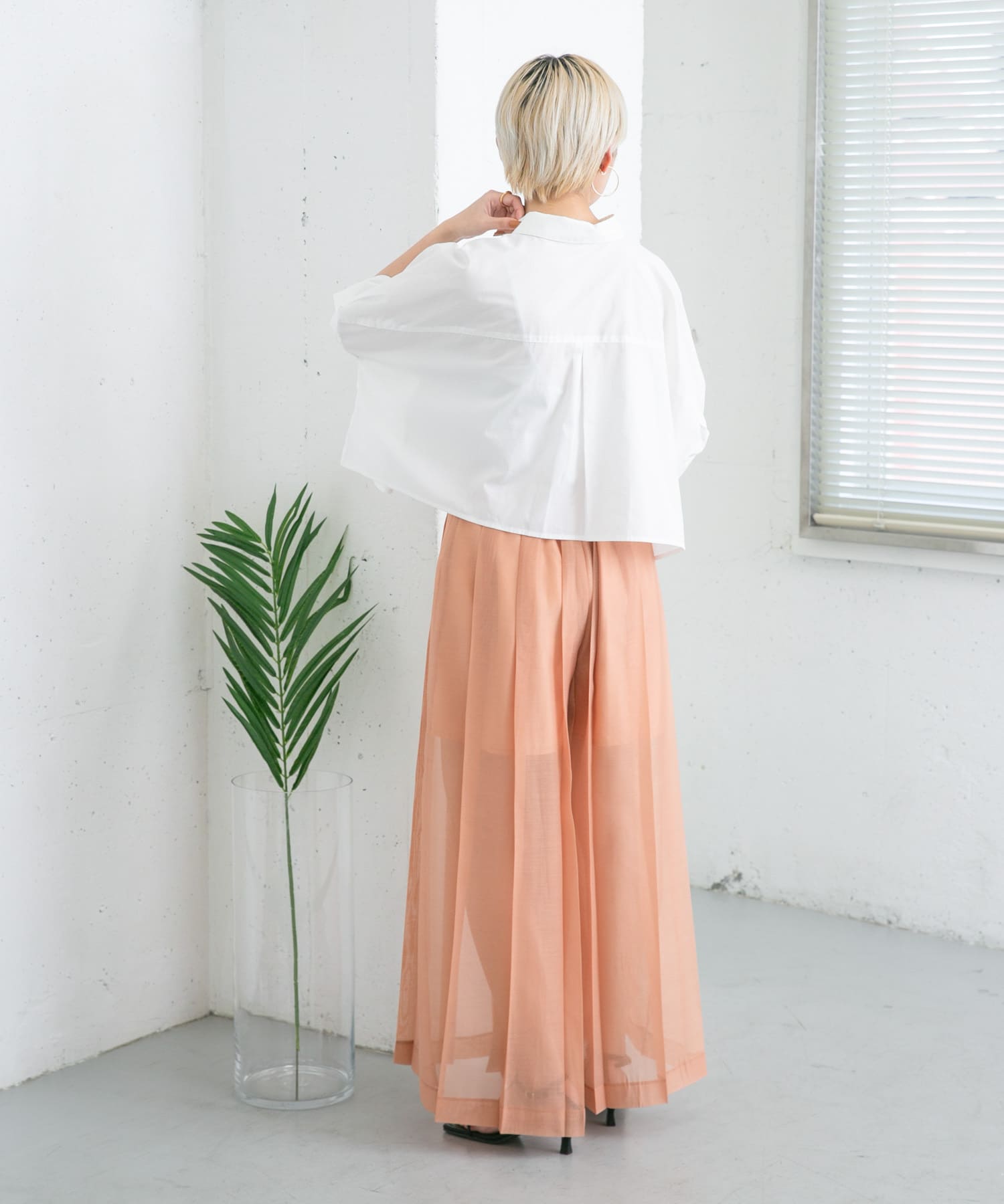 少しハリ感のあるシアー素材×プリーツ加工を組み合わせた涼しげなパンツ。短めの裏地が付いているので透け感を気にせず穿いていただけます。太めのシルエットは脚のラインを拾い過ぎず、さりげなくスタイルアップも叶えてくれます。