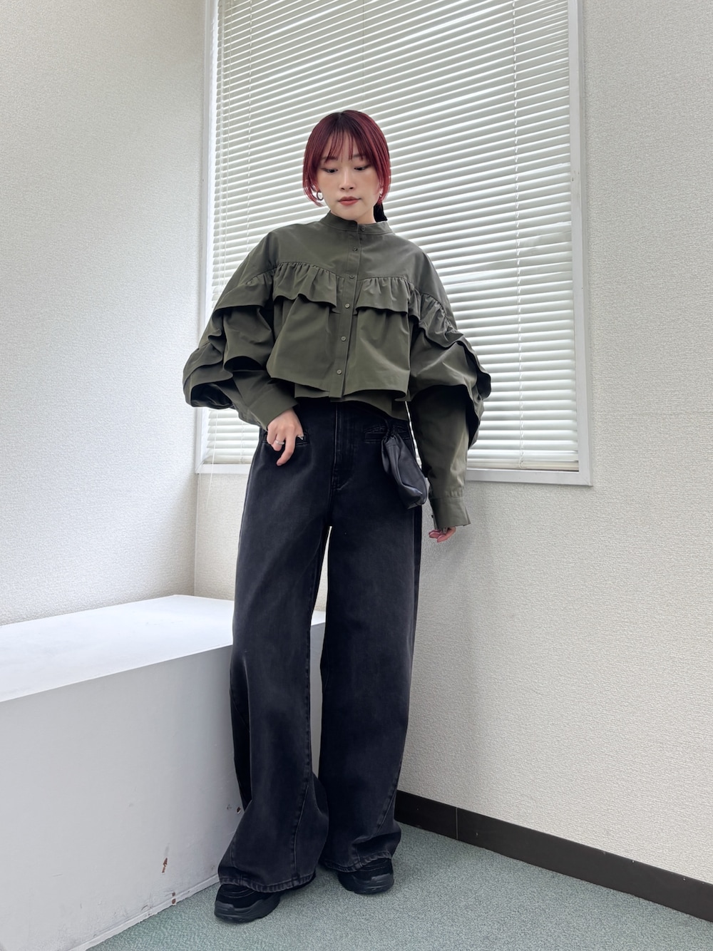 少し微起毛な表面感の素材を使用したブラウス。袖から身頃にかけてのラッフルデザインがポイントになっています。後ろは裾にかけてのタック仕様になっており、コンパクトな丈感も特徴的です。1枚で着ていただくのみならず、薄手のタートルネックを入れたレイヤードスタイルも雰囲気が変わるのでおすすめです。