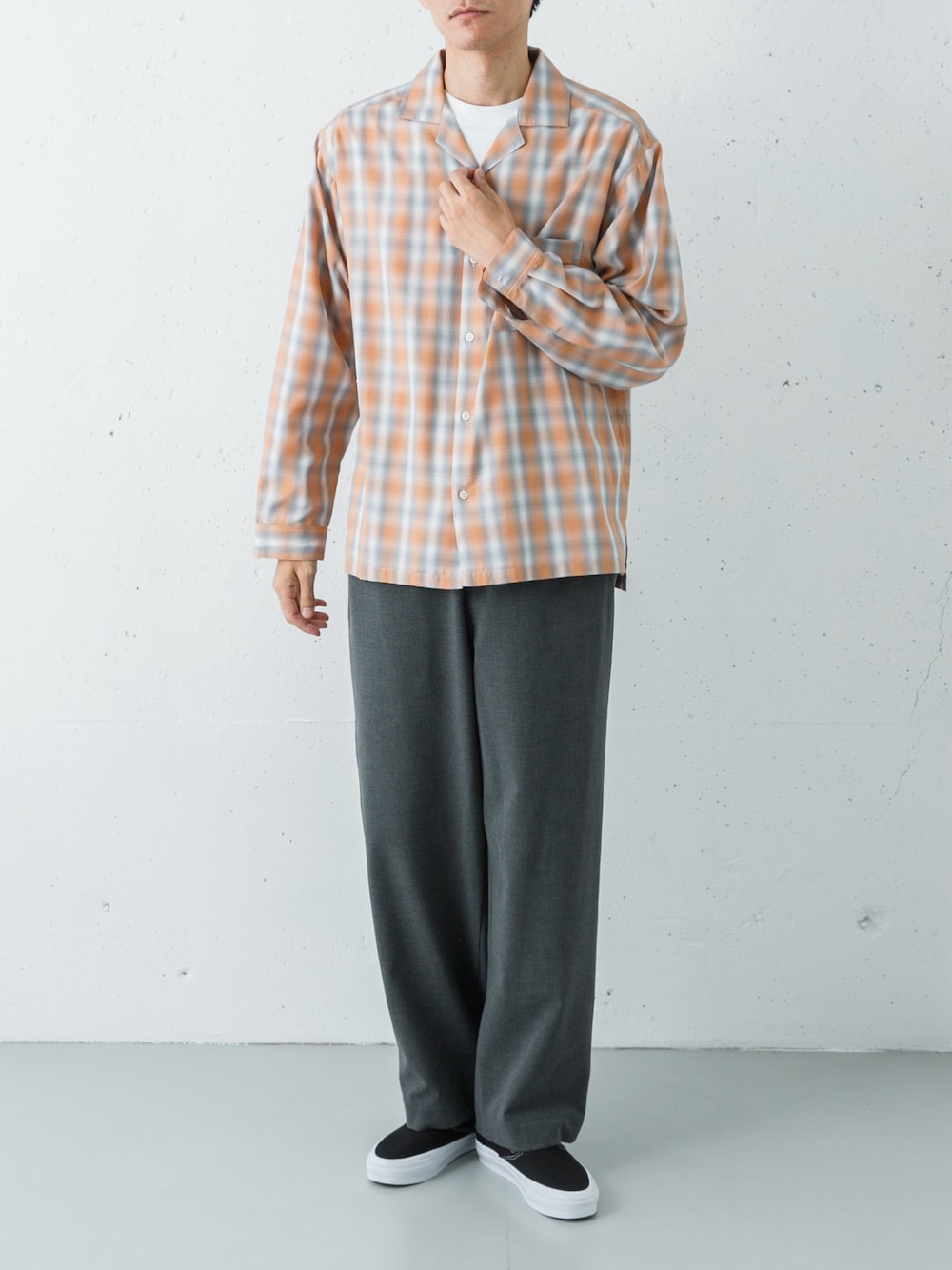 淡い色合いのチェックが程よく力の抜けた印象を作る長袖シャツです。オープンカラー寄りの襟とゆったりしたシルエットで、春は一枚でさらりと着るのはもちろん、薄手のニットや軽いジャケットのインナーにも収まりが良い一着です。