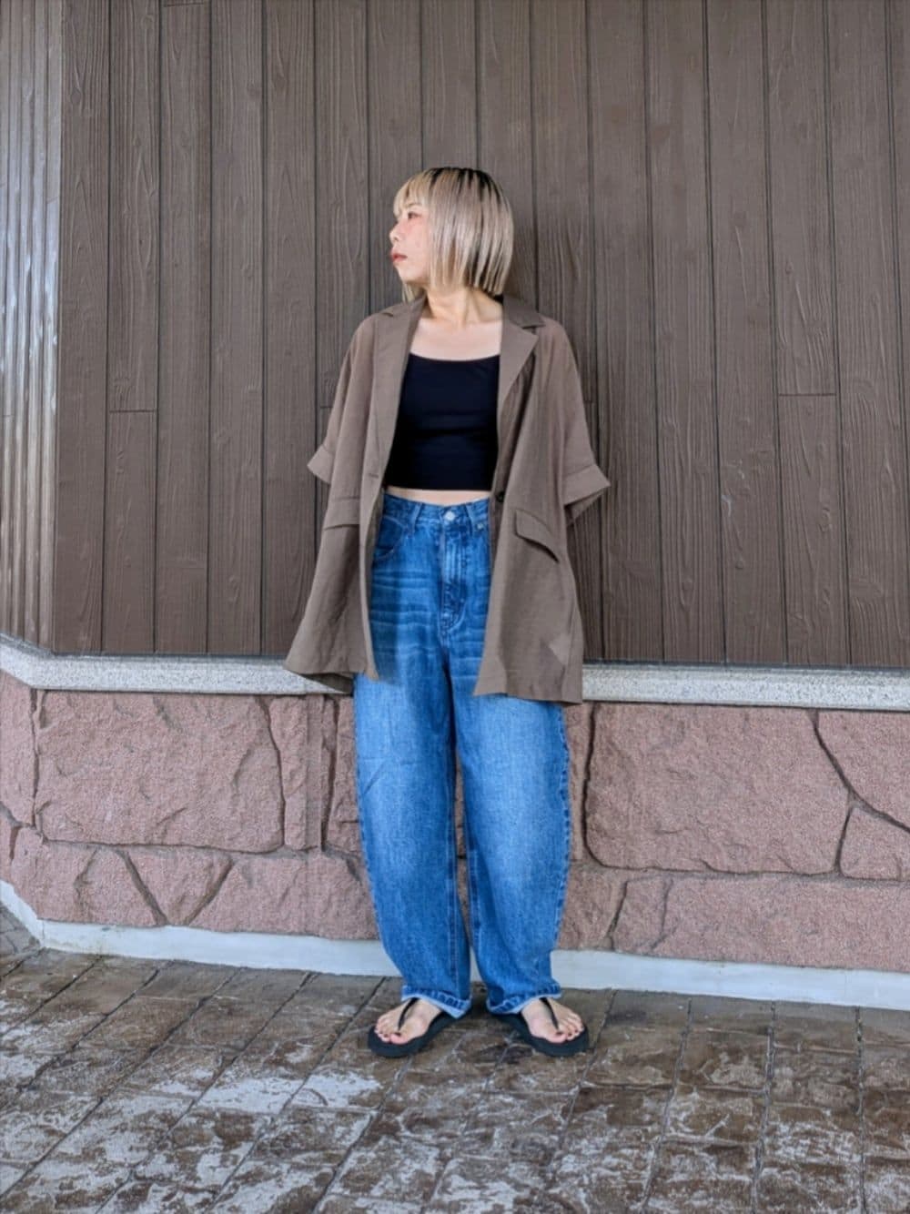 ボリュームのあるアイテムなので、トップスはすっきりとしたアイテムやショート丈が好相性◎