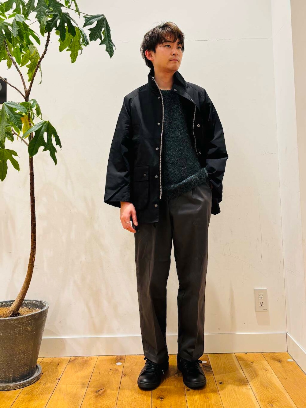 ・スラックスを合わせたややフォーマルな着こなしも可能